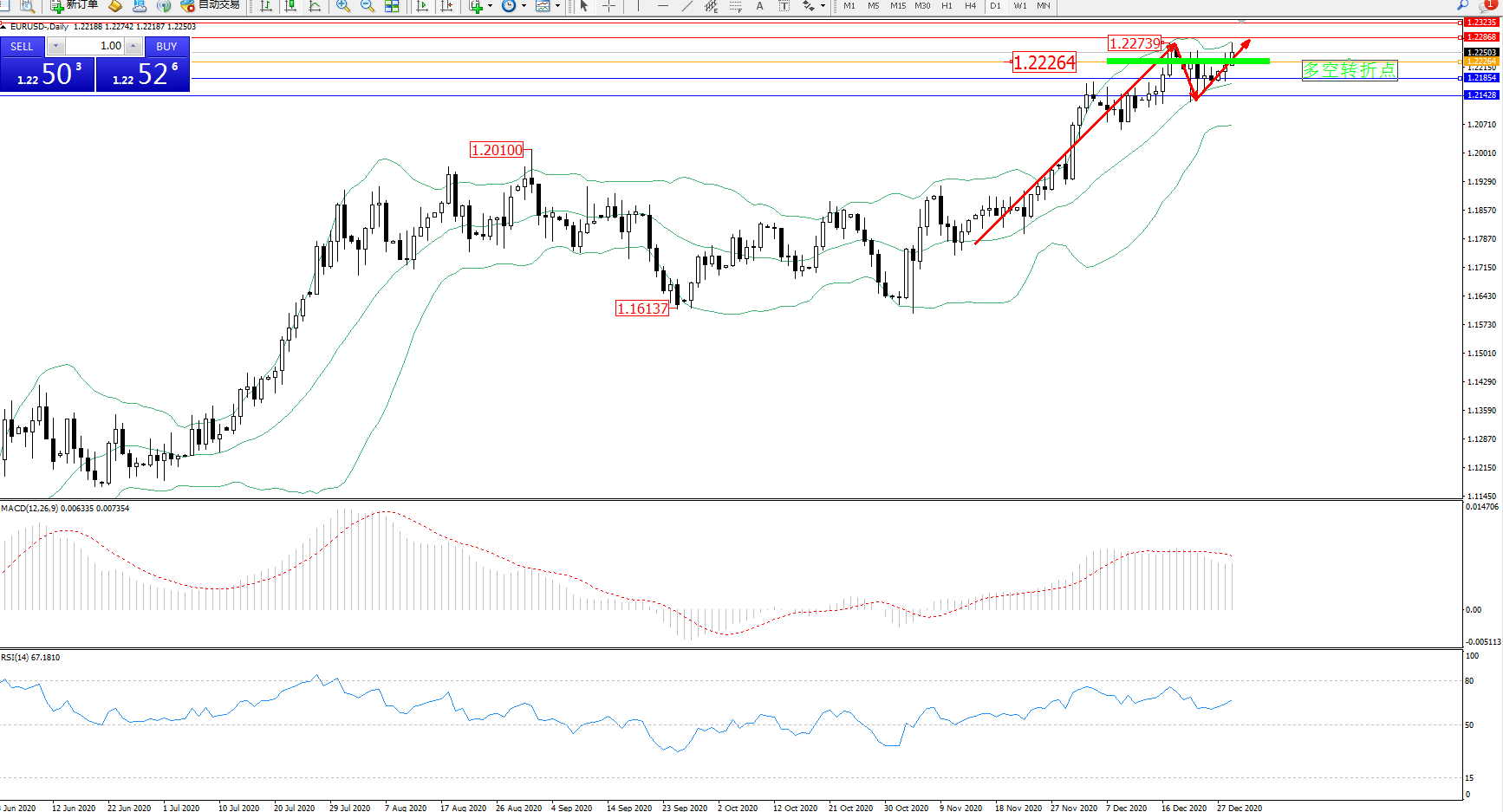 技术点评:多头动力延续布林带指标通道内中上轨区间维持震荡向上移动态势良好,高位抵达1.22739位置后遇阻出现短暂回撤,再度向上移动走势良好,有破位前高迹象,布林带指标呈收口走势后开始有张口迹象,关注中上轨区间关键节点,MACD指标处于多头区域维持整理平移走势持续中,RSI指标处于对头区域维持整理平移中;