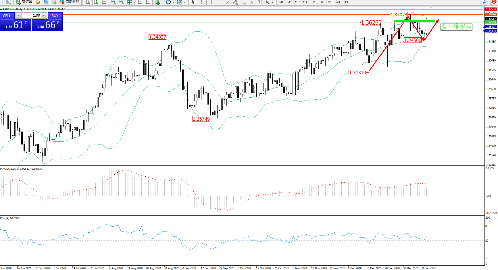 交易策略:1.36260上方看涨,目标1.37024、1.37534