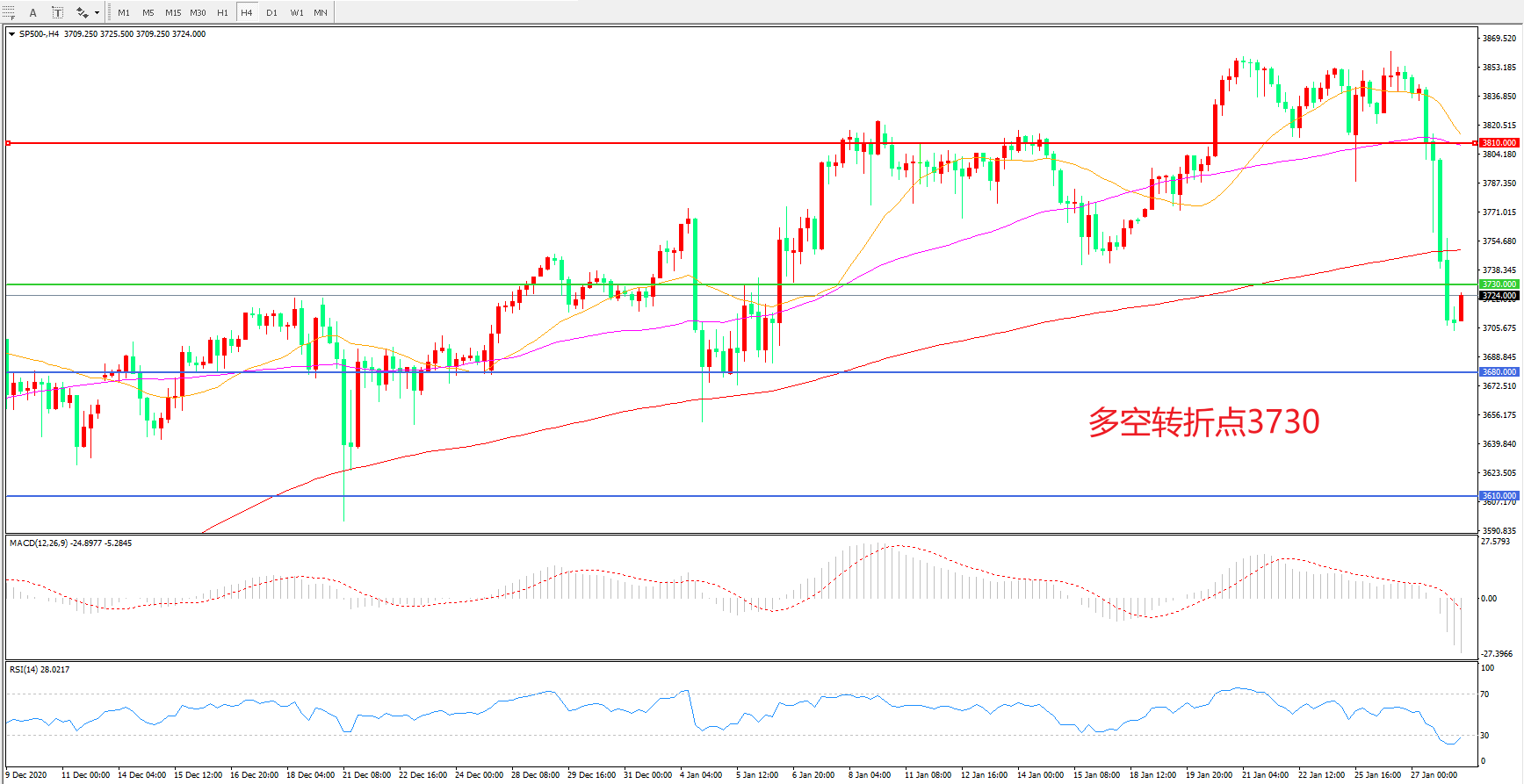 4小时图看,标普500长阴连续下破,整体表现低迷,200周期均线被跌破,3730成为上方阻力,MACD绿柱增加,RSI指标走平,日内延续震荡概率较大。