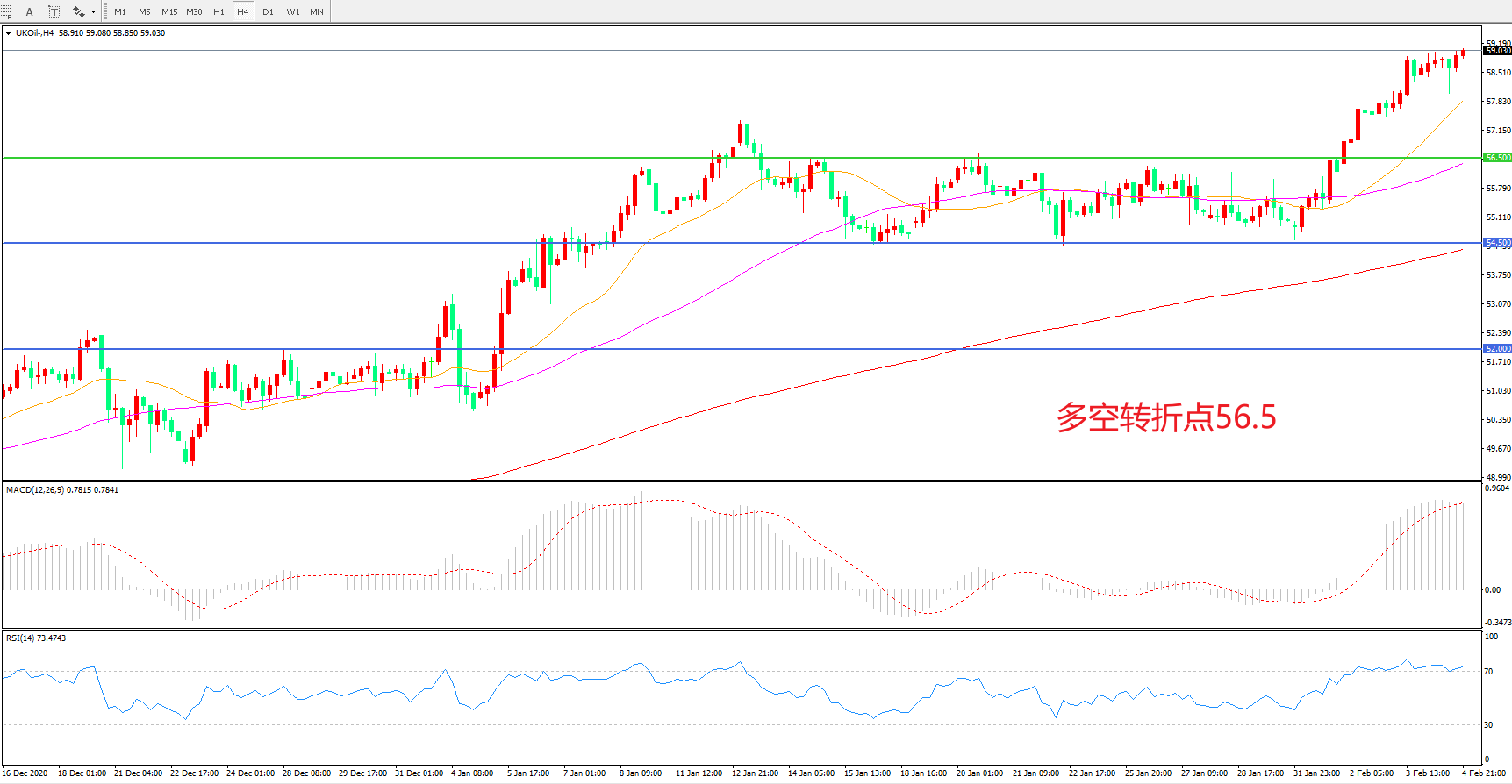 4小时图看,油价连续拉升,整体表现偏强,56.5阻力被快速突破后,多头趋势正在形成,MACD红柱增加,RSI指标向上,日内延续上行概率较大。