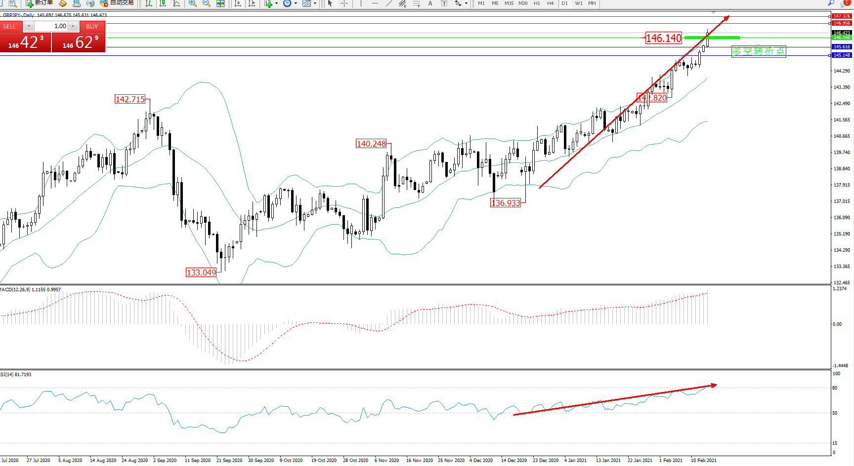 英镑兑日圆持续拉升上扬至146.423附近整理,英国迅速推广新冠病毒疫苗接种工作,且英国脱欧终成定局释放市场担忧情绪,经济前景维持乐观,但是从这两个方面来看,英国经济增长仍存在风险因素,英国脱欧结局为北爱尔兰问题带来长期阴影,英国与欧盟仍未很好地开启一段新关系,最重要的是,5月苏格兰大选可能会影响英国政局,苏格兰大选料将出现强烈呼吁苏格兰独立的声势;经济表现方面,2020年11月英国首相约翰逊称到了复活节情况将大为改观,经济已经开始出现乐观信号;英国新冠病毒疫苗得到迅速推广,但英国部长们释放不同的信息暗示可能会较预期更为长久地实施封锁措施。