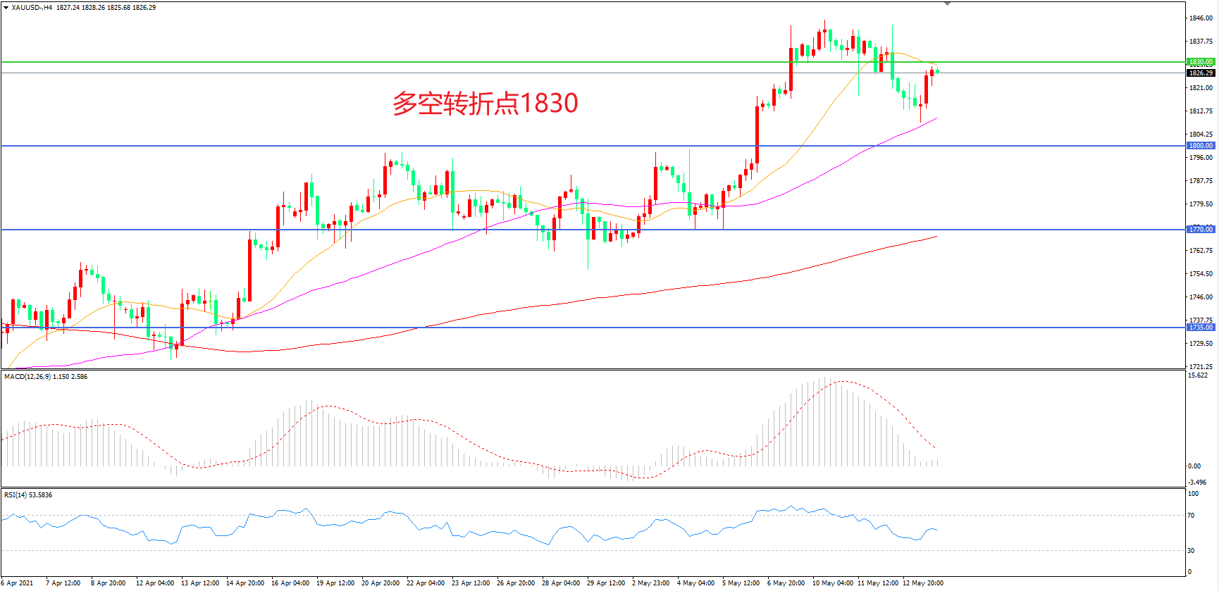 4小时图看,金价回踩55均线后再度拉升,显示下方支撑较强,短期表现相对强势,21周期均线成为短期阻力,1830成为多空分水岭,MACD红柱增加,RSI指标走平,日内震荡上行概率较大。