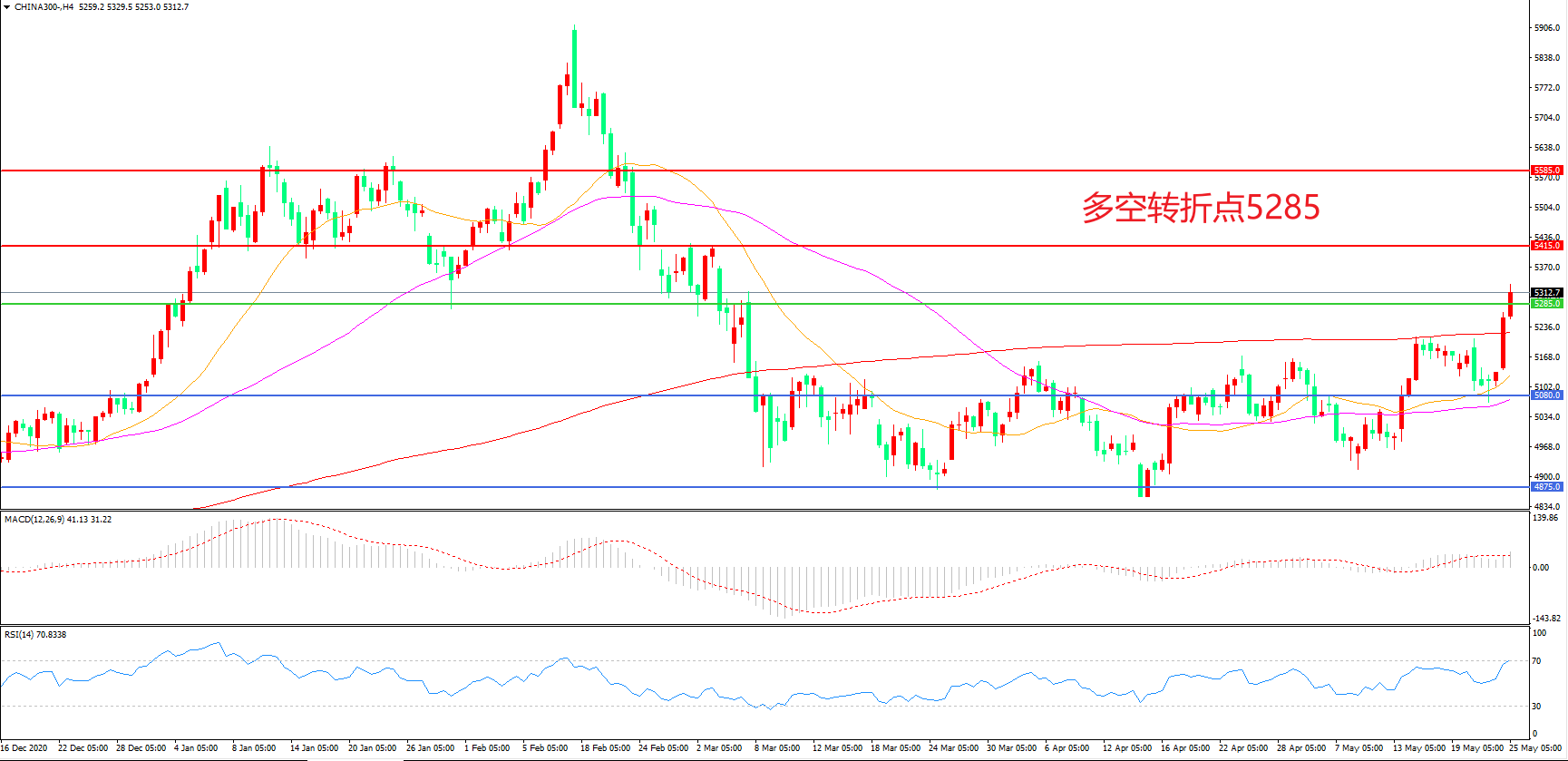 4小时图看,沪深300长阳连续拉升,突破前期整理区间,整体表现偏强,200周期均线成为下方支撑,MACD红柱增加,RSI指标向上,日内震荡上行概率较大。