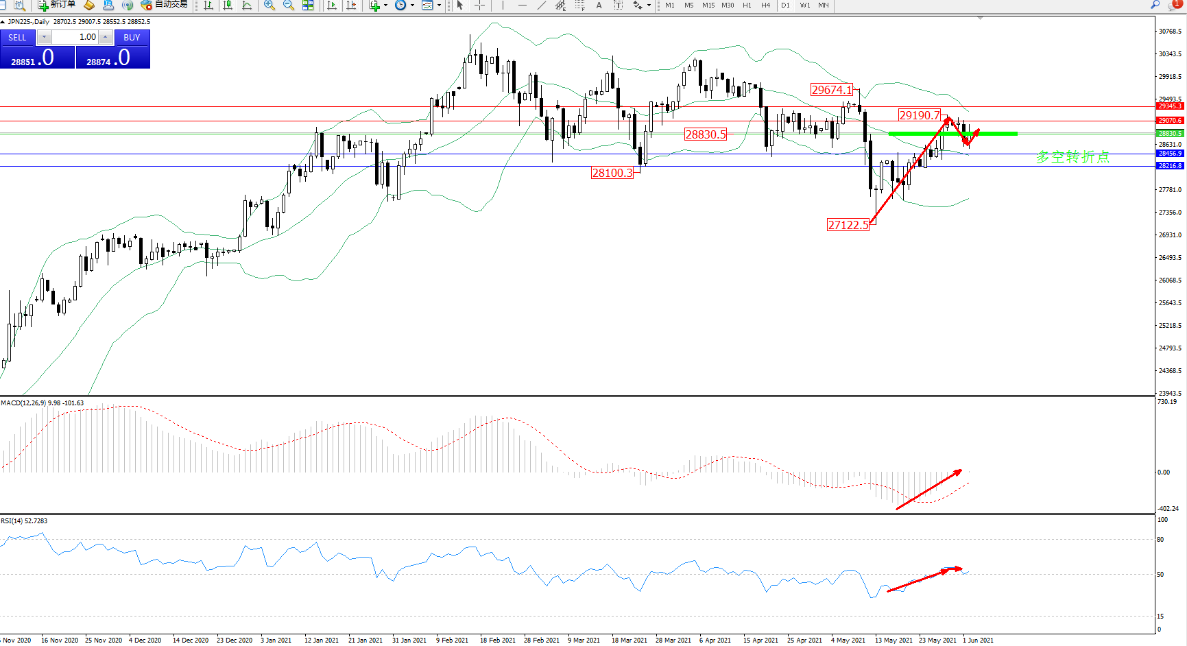 日经225指数6月2日(周三)收盘上涨122.66点,涨幅0.43%,报28937.00点。日本央行委员称:如果有工具加快物价上涨速度,那就已经用了。在耐心保持宽松的同时关注物价上涨。如果美联储缩减购债的预期或实际行动引发日元飙升,日本央行可能需要做出回应。日本央行5月份不购买ETF的决定是正确的,反映了3月份的评估结果。想不出任何新的工具来推高通胀,日本央行必须耐心地维持当前政策。日本央行必须关注通胀水平,以便在大流行消退后开始讨论政策正常化。很难衡量政策宽松的程度。日本东京新增487例新冠肺炎确诊病例。日本央行提供购买4500亿日元的3-5年期日本国债;日本央行提供购买2000亿日元的10-25年期日本国债;日本央行提供购买4750亿日元的1-3年期日本国债。