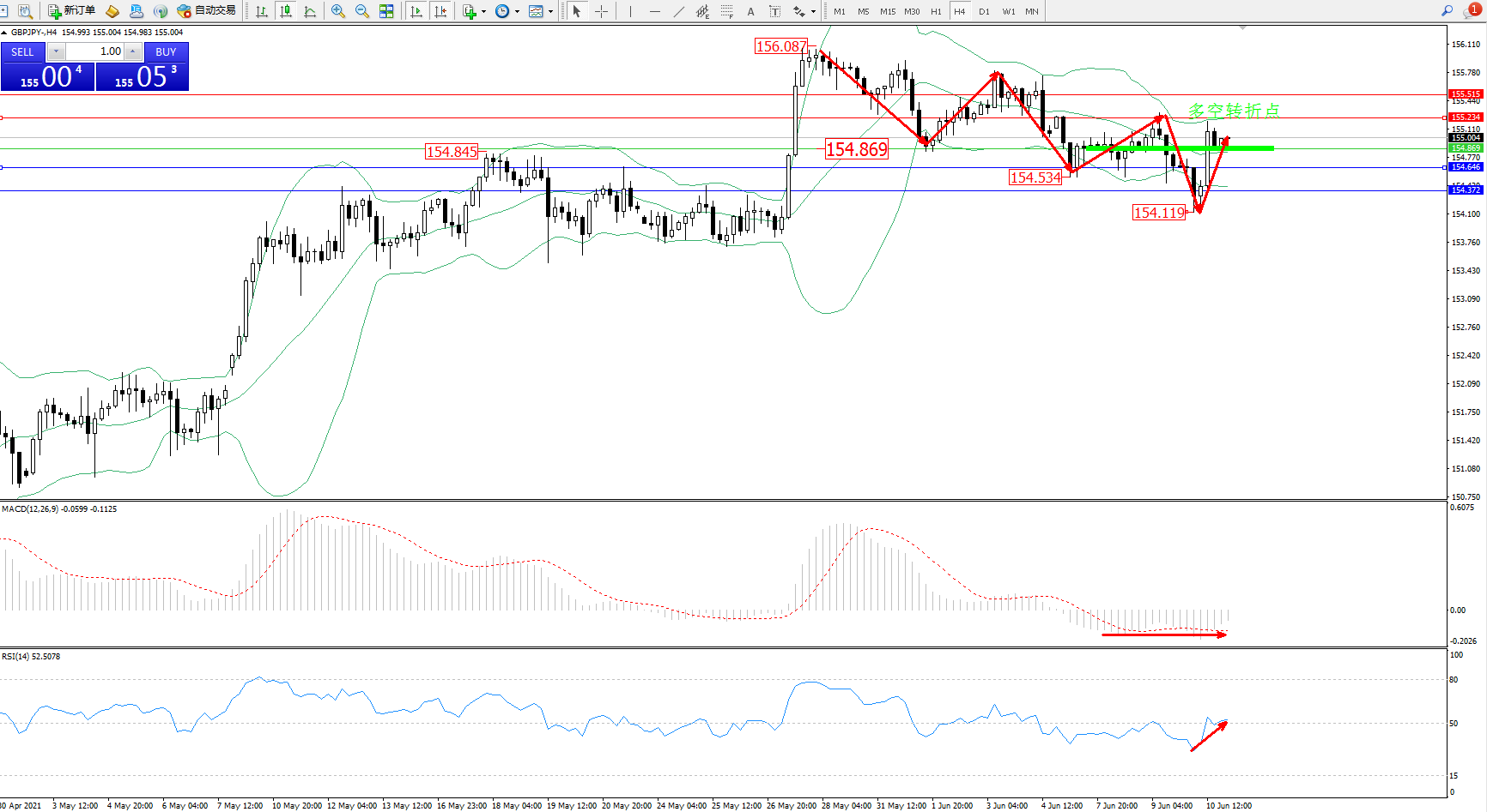 技术点评:空头动力长时间维持在布林带指标通道内呈阶梯式震荡向下移动,低位抵达154.119位置后再度得到支撑反转向上拉升,触及上轨附近节点后开始整理平移,多头动力有伺机入场强势上扬迹象,布林带指标呈收口走势开始平移后有缓慢张口迹象,关注中轨附近节点,MACD指标处于0轴线下方空头区域维持窄幅中,RSI指标处于空头区域持续震荡后开始反转上移至50均衡线附近徘徊;