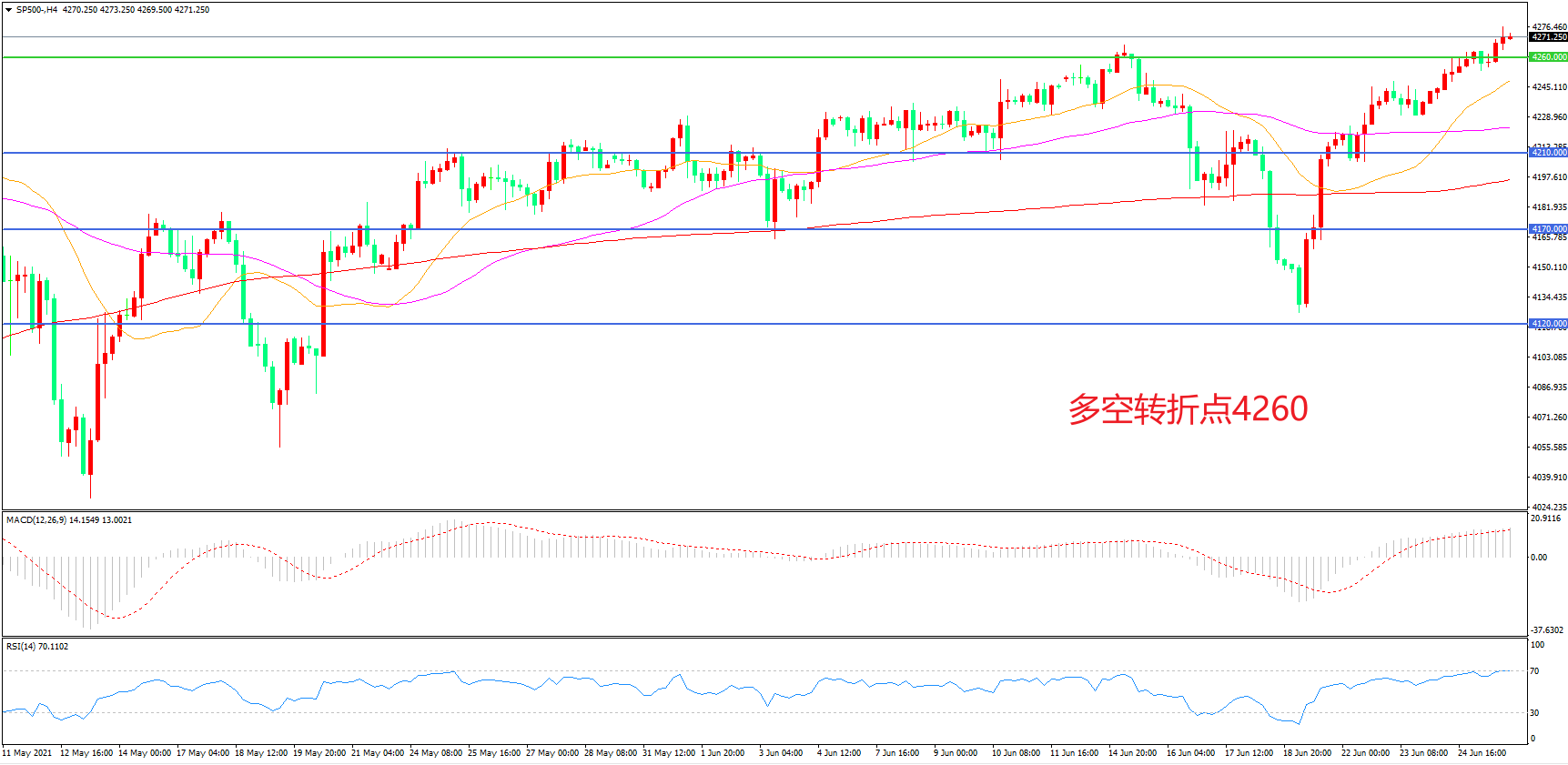 上周五(6月25日),备受美联储关注的通胀指标核心PCE物价指数创近三十年最快同比增速,但美联储官员继续淡化最近高通胀的影响,10年期国债收益率持续上行,美元指数在数据公布后跳水,标普500大幅拉升,收报4271.25点。宽松的货币政策、极低的利率加上大量的财政刺激让美股仍然在屡创新高的路上“蒙眼狂奔”。
