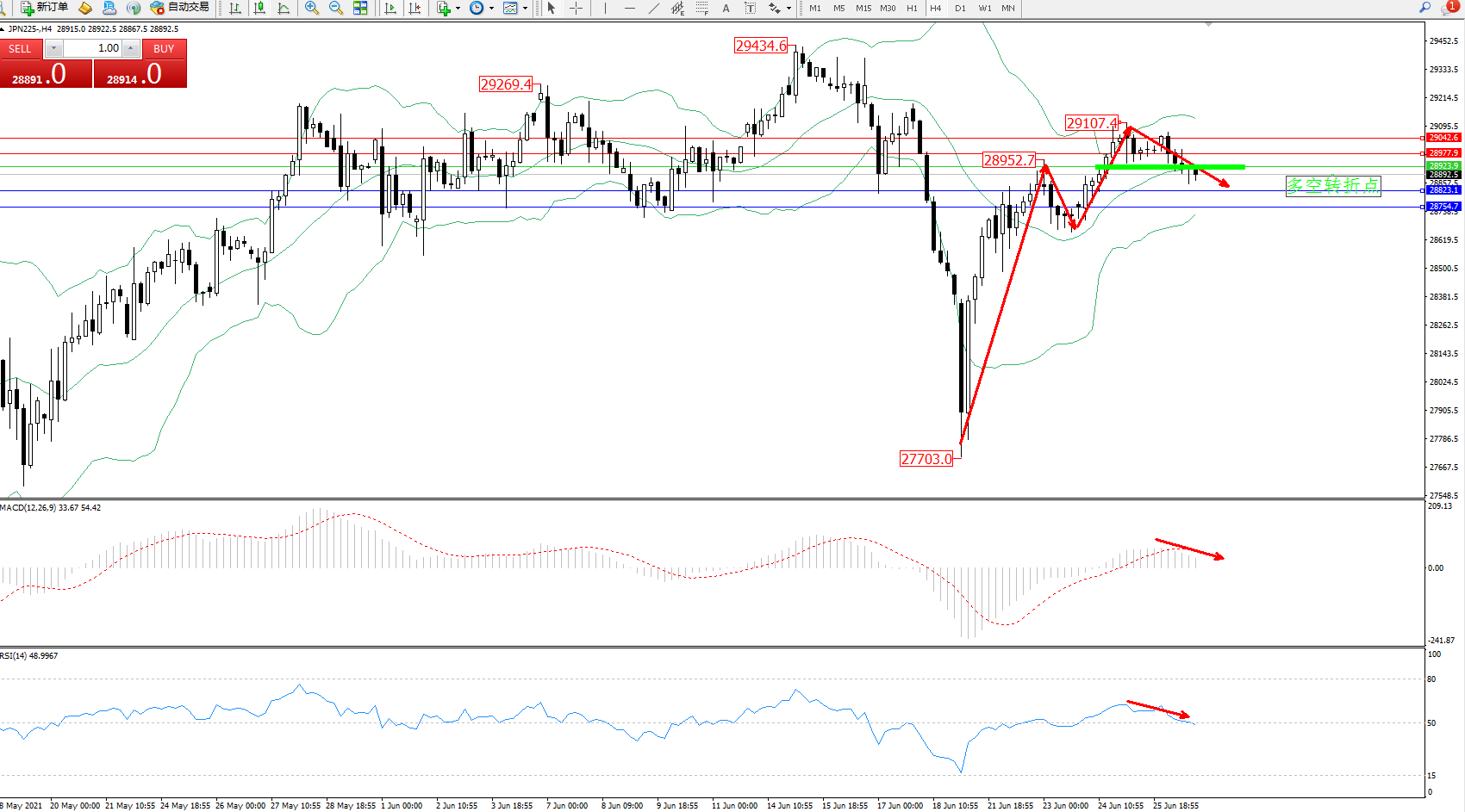 技术点评:多头动力持续震荡上扬至29107位置后遇阻,开始弱势缓慢持续下行,跌破布林带指标中轨后有继续下行态势,布林带指标呈上行趋势通道上扬后开始有缓慢收口迹象,关注中轨附近节点,MACD指标处于0轴线上方多头区域弱势徘徊中,RSI指标处于多头区域维持窄幅整理后缓慢回撤至50均衡线附近整理;