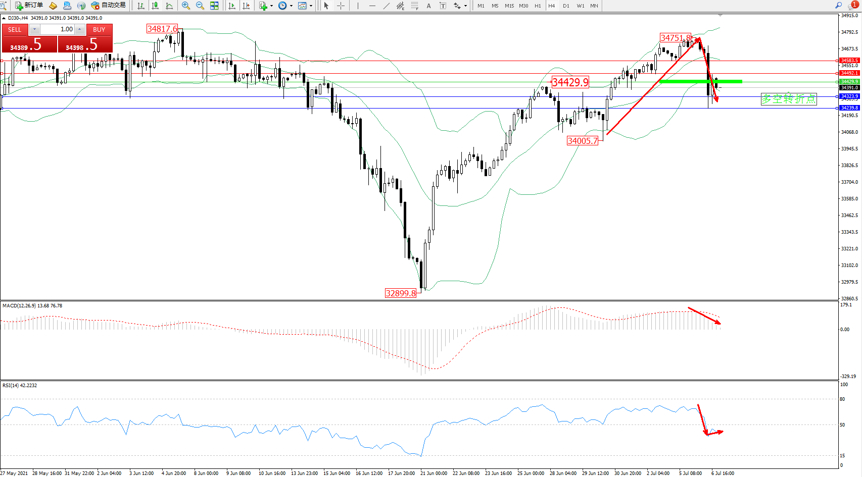 技术点评:多头动力延续布林带指标通道中上轨区间持续震荡上扬,高位抵达34751位置遇阻短暂震荡后空头动力入场急速下挫,跌破布林带指标下轨附近后短暂回升震荡,布林带指标呈张口走势持续中,关注下轨附近节点,MACD指标处于多头区域维持整理平移后回撤至0轴线附近徘徊,RSI指标处于多头区域持续震荡后急速下挫至50均衡线下方卡死整理平移;