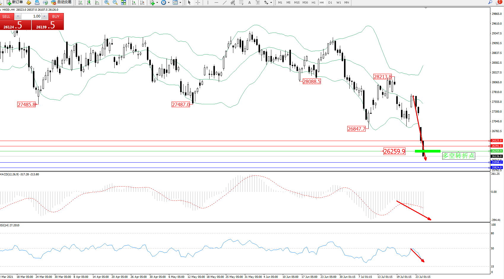 香港恒生指数7月26日(周一)收盘下跌1129.66点,跌幅4.13%,报26192.32点;港股三大指数暴跌,且均创年内新低价,恒生科技指数更是创下有记录以来最低。恒生科技指数跌6.57%报6790点。内地监管层对教育和科网行业出招监管,教育股和科技龙头股均大跌,拖累市场气氛降至冰点,新东方、思考乐教育、卓越教育集团均暴跌超40%,快手、网易、美团均大跌超11%,腾讯大跌近8%。今日大市成交额放大至2682亿港元较上个交易日翻倍,南下资金净流出26.29亿港元。本次双减文件对K12教培的治理力度是史无前例的,线上和线下皆是如此。明令禁止学科类培训以各种方式上市,并且牌照不再新增,扩张路径受阻;线上学科类培训重新审批,搜题等工具类APP或面临下架,在线外教英语培训无法继续使用境外外籍老师。K12教培行业受到极大冲击,将面临向其他赛道转型的挑战,如素质教育或职业教育培训。