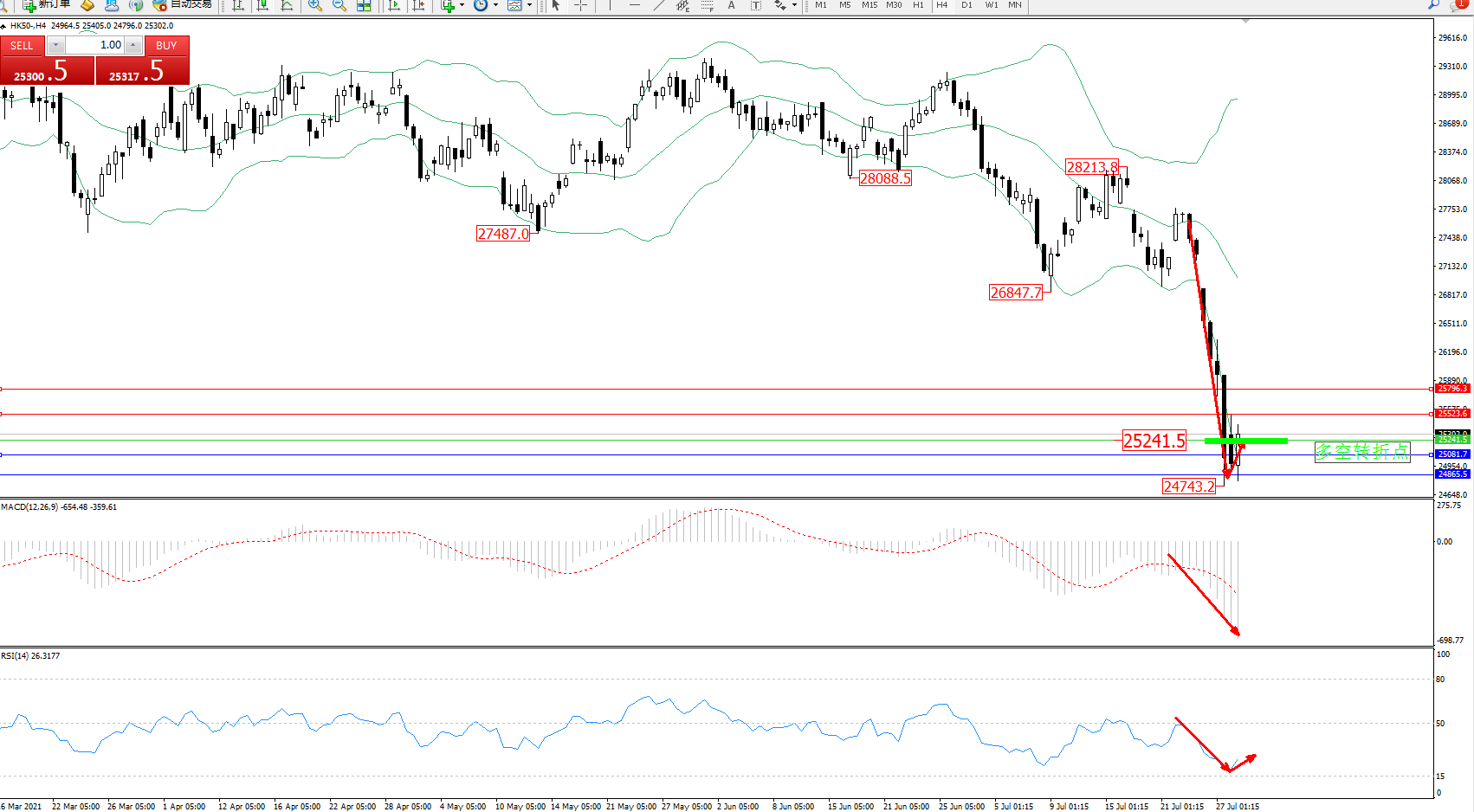 技术点评:空头动力延续布林带指标下轨附近急速下挫,低位抵达24743位置后得到短暂支撑,开始处于低位震荡,空头动力有短期减弱迹象,布林带指标呈张口走势持续中,MACD指标处于空头区域持续下行态势良好,RSI指标处于空头区域不断震荡下行,低位开始有短暂反转走势迹象;