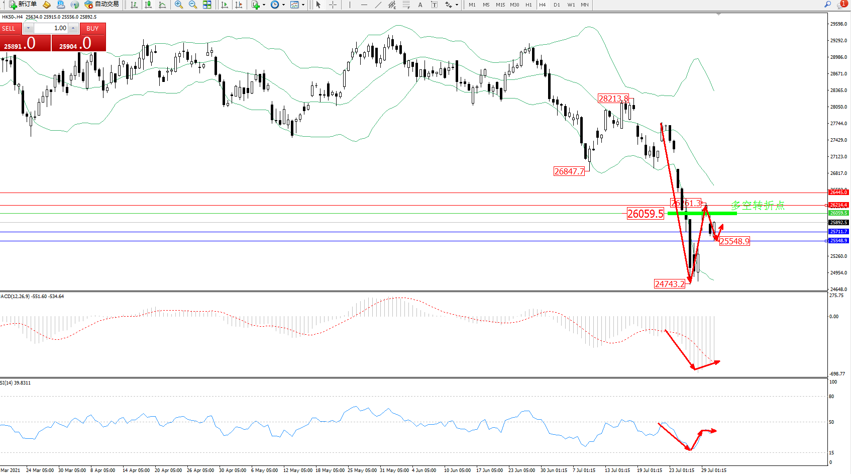 香港恒生指数7月30日(周五)收盘下跌354.29点,跌幅1.35%,报25961.03点;昨日迎暴力反弹的港股市场再度大跌,三大指数午后跌幅虽有所收窄,但仍有较大跌幅,市场再度陷入低迷。恒生科技指数跌2.56%报6780点,盘中一度暴跌近5%。引领市场反弹的大型科网股再度重挫,十分打击市场情绪,快手大跌7.4%,美团大跌近6%,百度、阿里巴巴大跌4%,腾讯跌2.6%;今日大市成交额为1896亿港元,南下资金逆势净流入6.43亿港元。金管局今日宣布,将现为临时性的美元流动资金安排定为恒常措施,美元流动资金安排的主要操作细则将维持不变,提供的流动性总额为100亿美元,由金管局每星期透过有竞争性的投标方法,以回购交易形式为银行提供为期七天的有期美元流动性。最低投标利率现时定为0.25厘,即与恒常性FIMA R epo Facikity的利率一致。