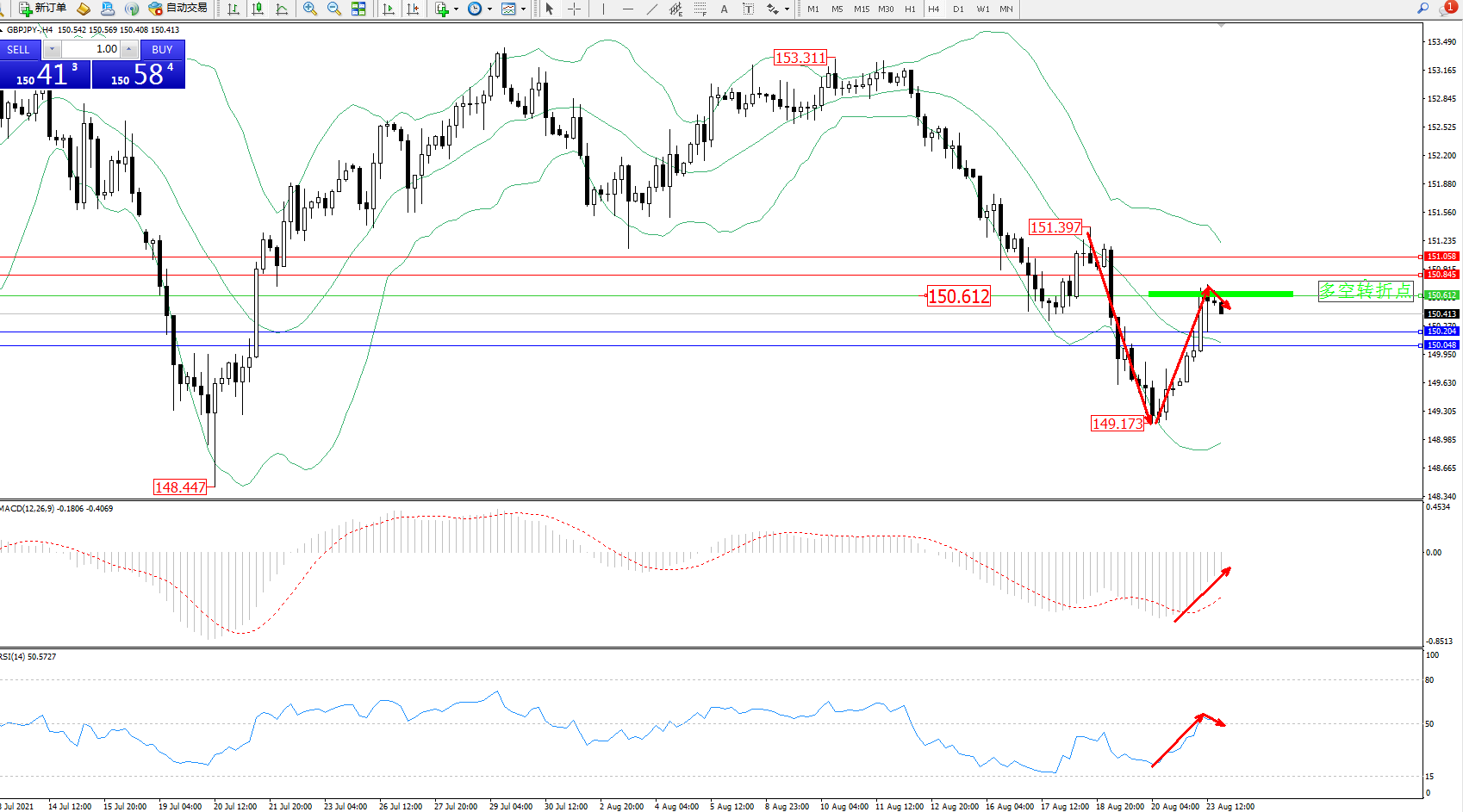 备选策略:150.612上方看涨,目标150.845、151.058