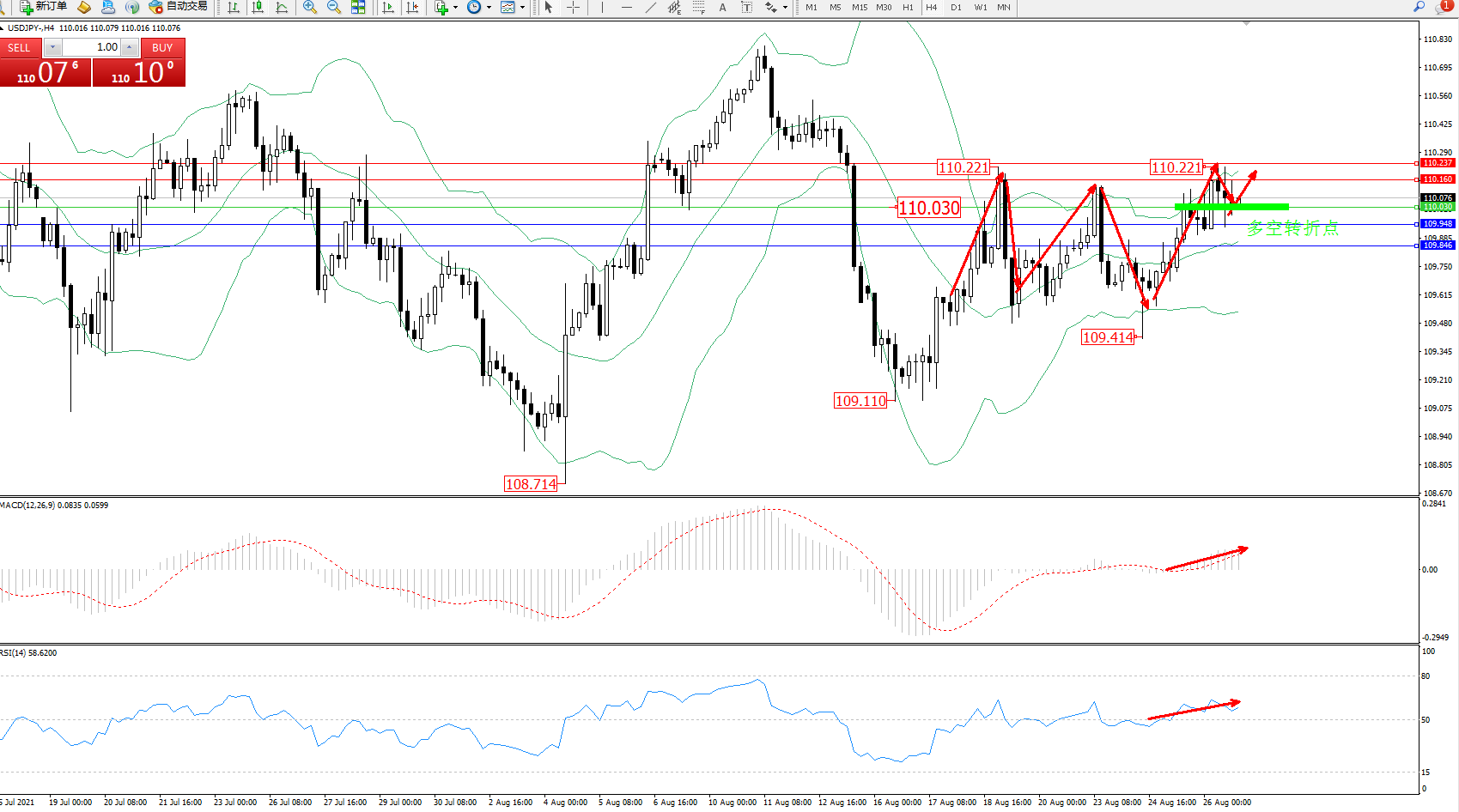 技术点评:多头动力强势拉升至布林带指标上轨附近节点后维持宽幅震荡,期间多次触及上轨附近节点后遇阻回撤,随后多头再度上扬至110.221位置后遇阻调整,布林带指标呈缓慢张口走势中,MACD指标处于多头区域维持整理缓慢上移,RSI指标处于50均衡线上方维持弱势徘徊中;