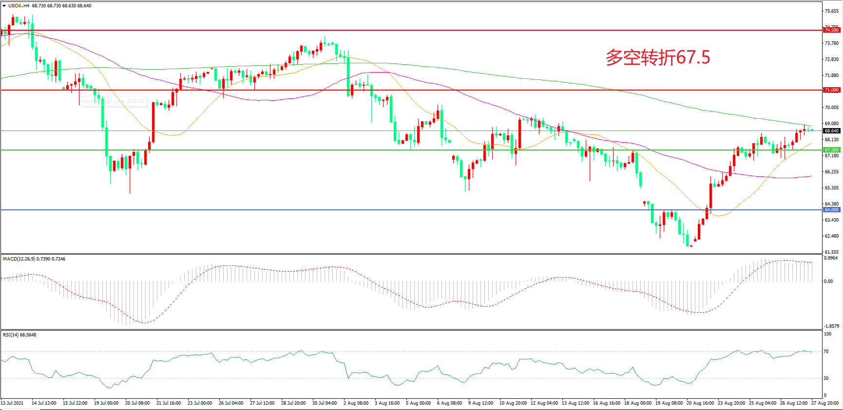 4小时图看,油价突破67.5美元后延续窄幅震荡,21周期均线成为下方支撑,200周期均线成为上方阻力,MACD红柱增加,RSI指标走平,日内震荡上行概率较大。
