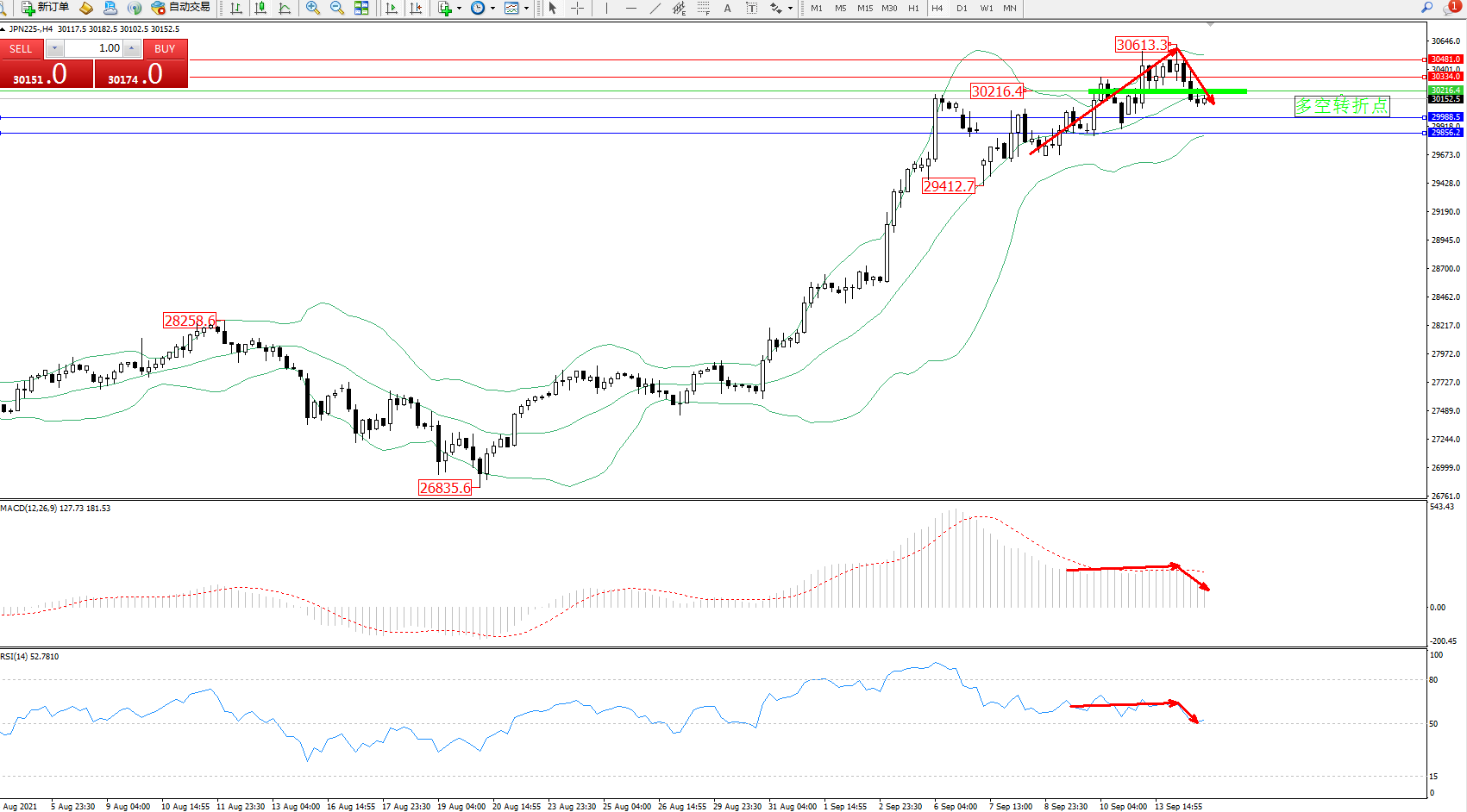 技术点评:多头动力延续布林带指标通道中上轨区间持续震荡上扬,高位抵达30613位置后遇阻整理回撤,触及布林带指标中轨附近节点后开始缓慢向下移动,布林带指标呈收口走势中,MACD指标处于多头区域维持整理平移后开始缓慢下行,RSI指标处于多头区域维持整理后持续下行至50均衡线附近徘徊;