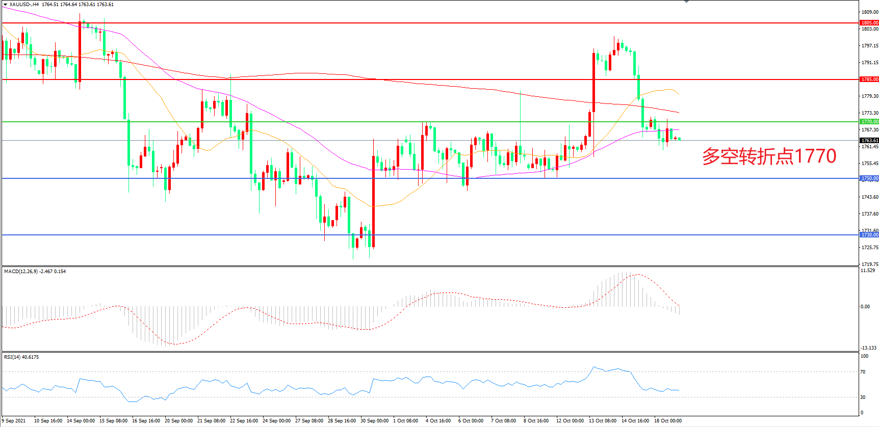 周一(10月18日),在美联储缩债计入预期之后,市场开始炒作美联储明年升息的预期,金价承压下行,收报1763.82美元/盎司。目前市场最大的压力来自于美国10年期国债收益率的上涨,美债的连续飙升提高了持有非收益性资产的机会成本,削弱无息资产黄金的吸引力,由于美联储官员们纷纷表达支持尽快缩减QE,短期内金价可能仍将继续承压。