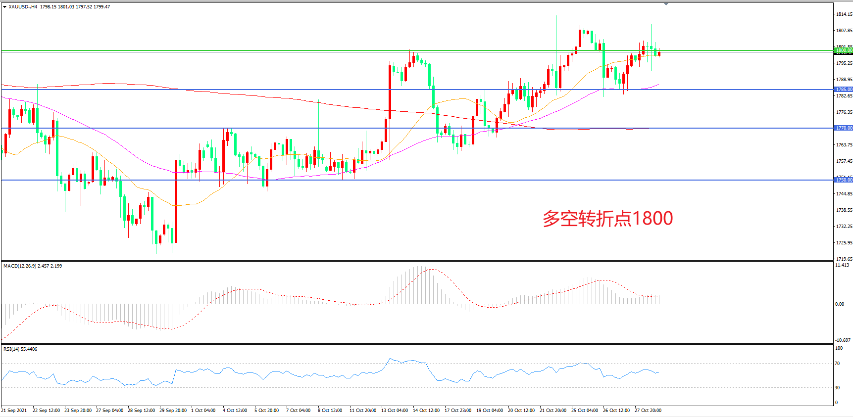 周四(10月28日),美国方面公布一系列重磅的经济数据。其中最受市场关注的美国三季度GDP初值不及预期,三季度核心PCE物价指数初值较大幅度回落,数据公布之后,金价自高位回落7逾美元,收报1800美元/盎司。市场目前关注的焦点是美联储11月2日至3日的会议,在美联储主席鲍威尔近期发表有关缩减资产购买的言论后,该会议将决定中期金价的命运。
