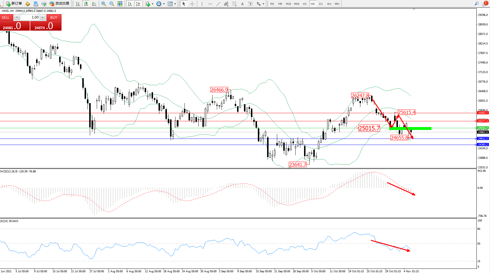香港恒生指数11月5日(周五)收盘下跌354.68点,跌幅1.41%,报24870.51点;港股午后跌幅进一步扩大,三大指数盘中均下挫2%。恒生科技指数跌1.55%报6276点。权重科技股与大金融股齐跌拖累大市下挫,阿里巴巴、美团跌超3%,腾讯跌2.79%,三者拖累恒指下跌超200点,,餐饮股反弹领涨,海底捞涨超5%,苹果概念股、半导体股、啤酒股、体育用品股小幅走高。今日大市成交额为1283亿港元,南下资金逆势净流入19.62亿港元。
