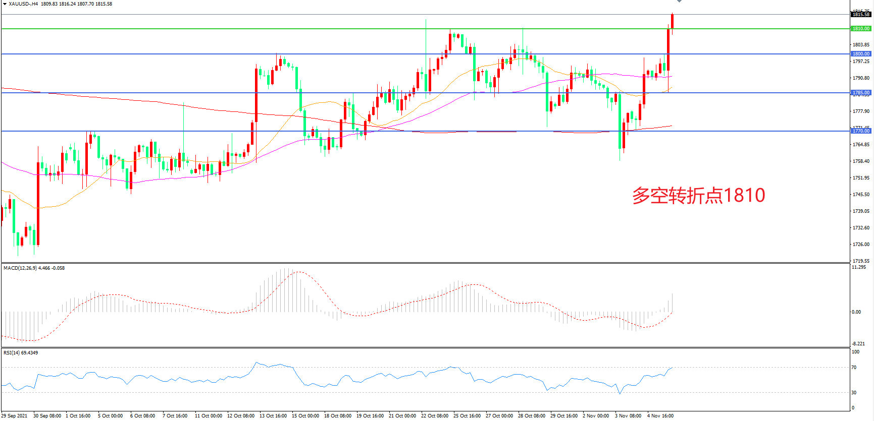 4小时图看,金价回踩21周期均线后连续拉升,短期走势回暖,1815阻力被突破,MACD红柱增加,RSI指标向上,日内延续上行概率较大。