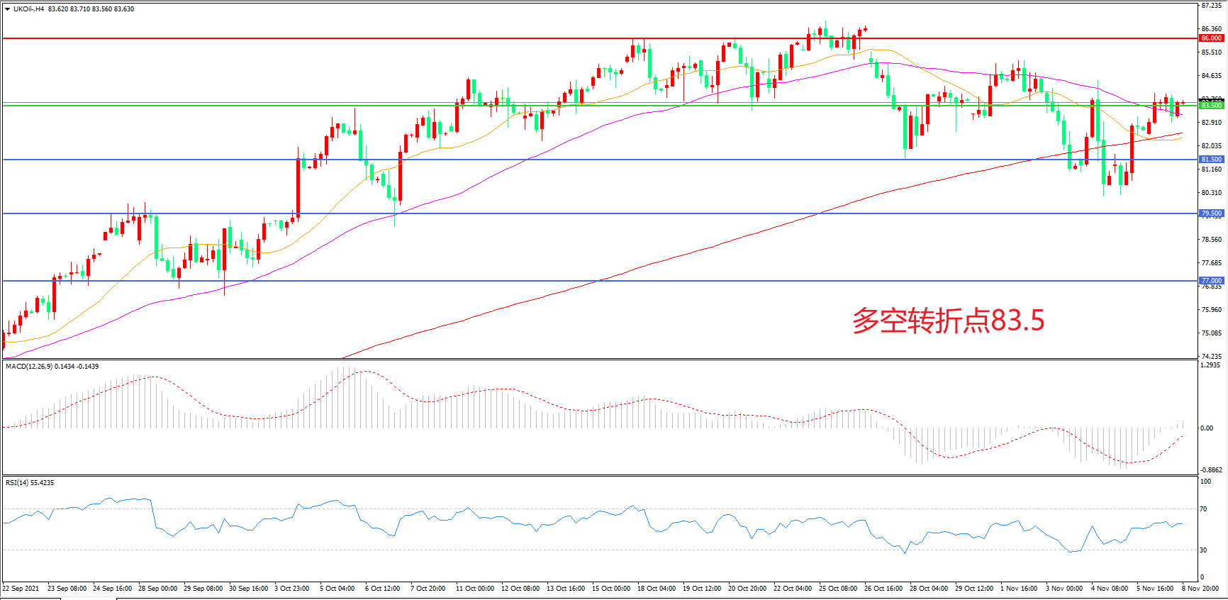 4小时图看,油价围绕83.5美元窄幅震荡,多空博弈逐渐激烈,81.5美元成为短期支撑,86成为中期阻力,MACD绿柱缩短,RSI指标走平,日内延续震荡概率较大。