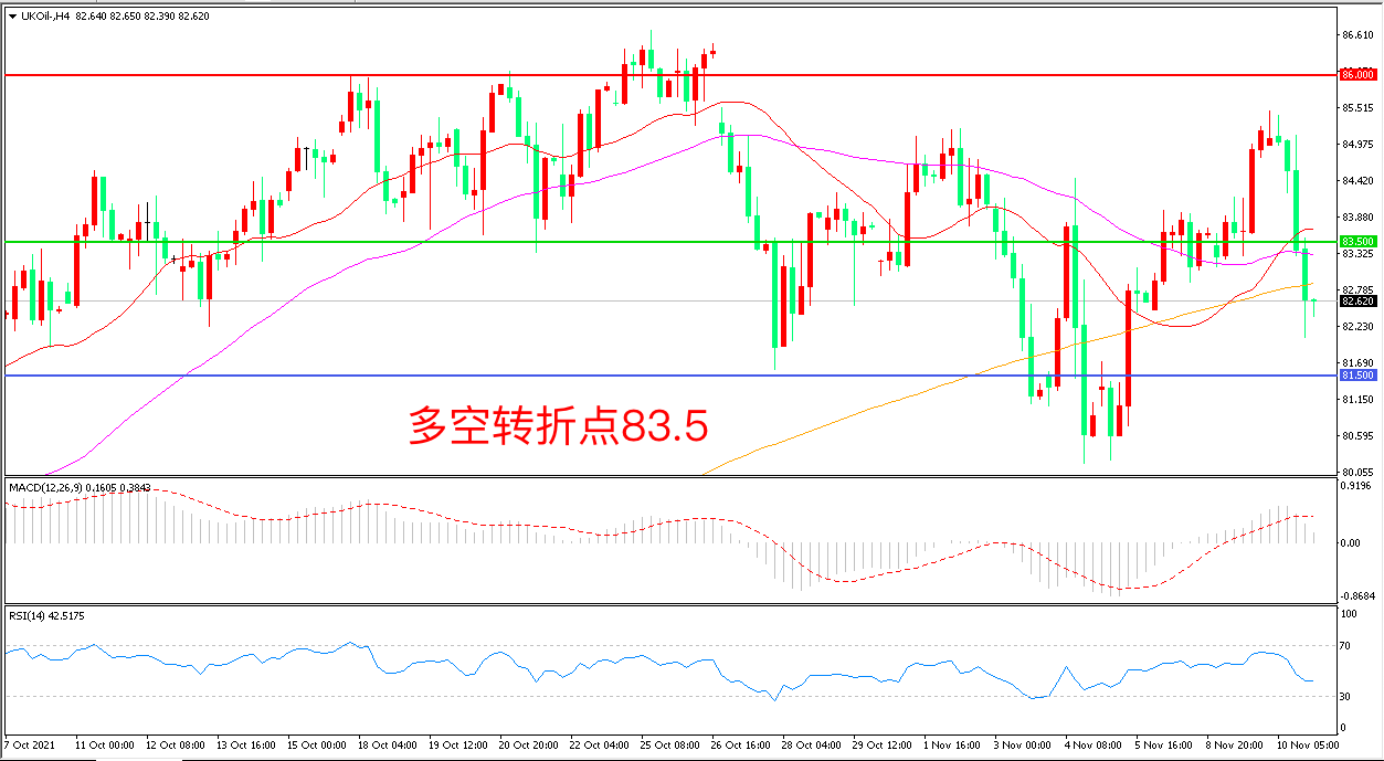 4小时图看,油价触碰86美元阻力后破位大跌,短期走势陷入低迷,81.50成为支撑,83.5成为多空分水岭,MACD红柱缩短,RSI指标走平,日内震荡上行概率较大。