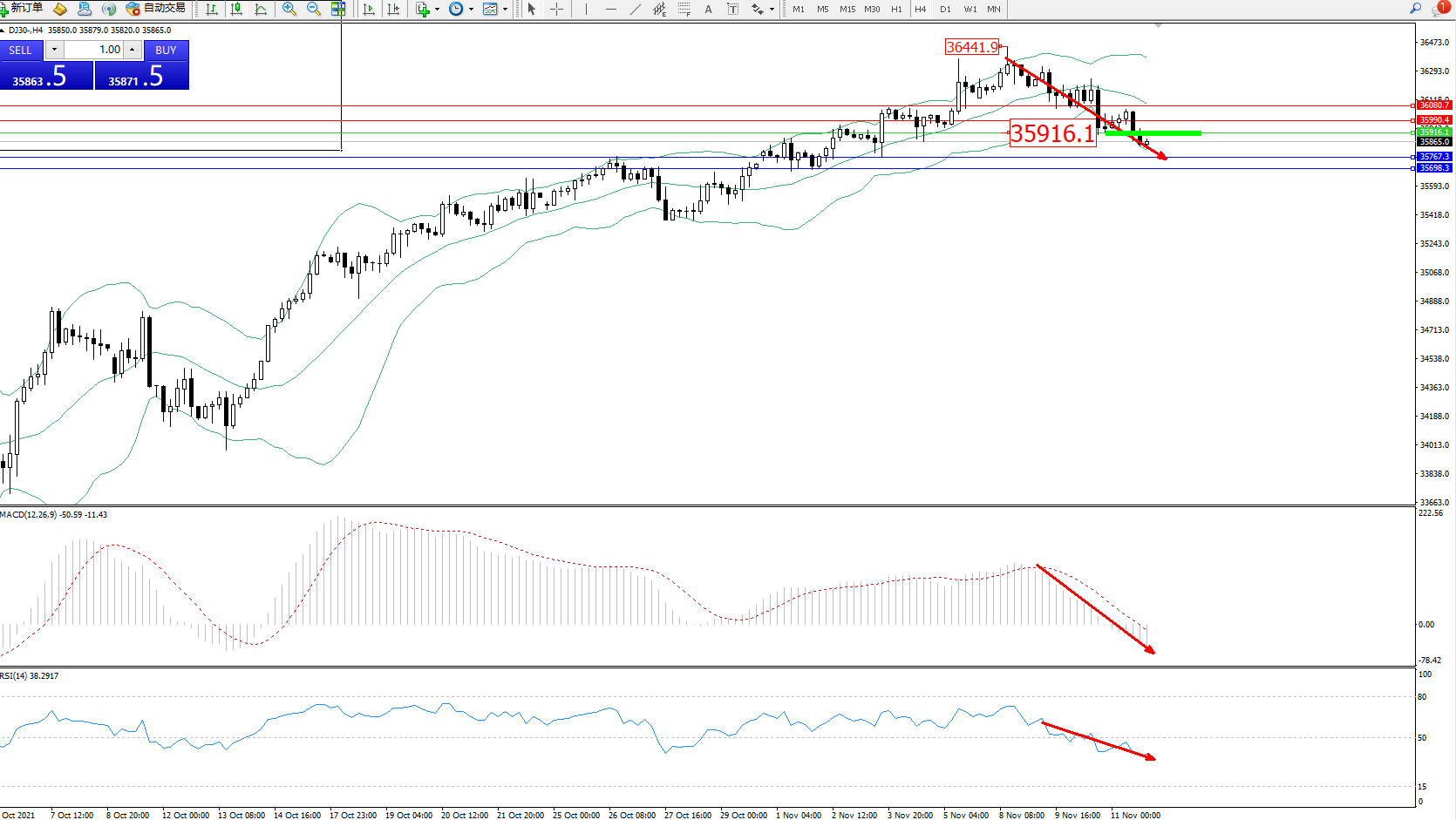 技术点评:多头动力延续布林带指标通道中上轨区间持续震荡上扬,高位抵达36441位置遇阻整理回撤,延续布林带指标下轨持续震荡向下移动,短期空头动力有进一步向下移动态势,布林带指标呈缓慢张口走势迹象,MACD指标处于多头区域维持整理缓慢下移至0轴线附近徘徊,RSI指标空头动力维持整理缓慢下行至50均衡线下方徘徊;