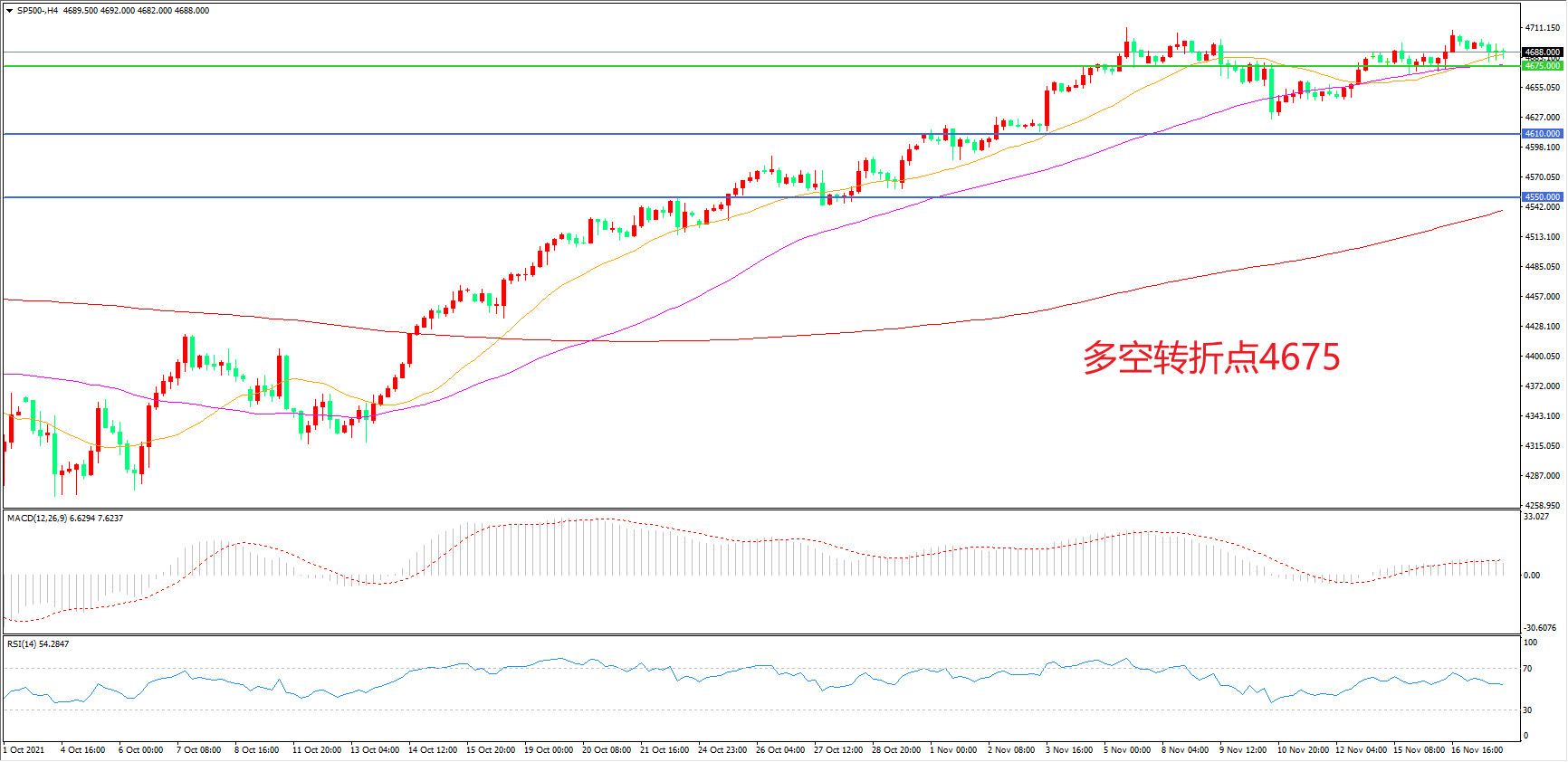 4小时图看,标普500以4675一线为依托窄幅震荡,短期波幅不大,均线系统粘合形成支撑,MACD红柱增加,RSI指标走平,日内震荡上行概率较大。