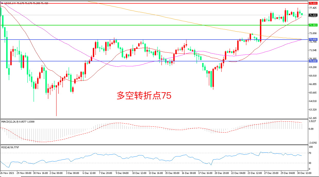 周三(12月30日),2021年还剩最后一个交易日,多空似乎都表现得比较谨慎,美国WTI原油延续窄幅震荡,收报76.50美元/桶。虽然奥密克戎传播的速度比较快,但目前仍然没有对油价产生致命的影响,目前OPEC+将于下周再次举行会议,如果最终增产结果与预期出现较大出入将引发油价巨幅波动。