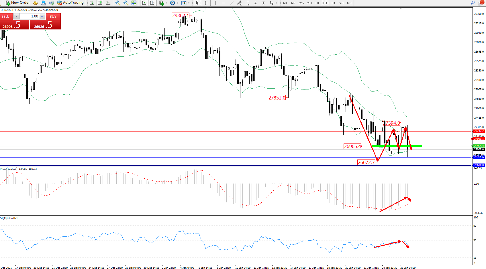 技术点评:空头动力延续布林带指标通道中下轨区间持续震荡下行,低位抵达26672位置节点后震荡,短期纠结于布林带指标通道低位宽幅震荡中,布林带指标呈缓慢张口走势中,MACD指标处于空头区域低位震荡缓慢上移后整理,RSI指标处于50均衡线下侧弱势徘徊中;