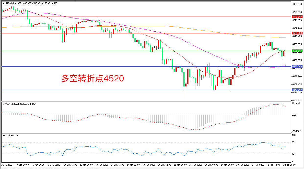 周四(2月3日),四季度盈利逊于预期的Facebook母公司Meta跳空低开,盘中跌幅曾达27%,悲观情绪弥漫美股,标普500小幅回落后收报4520点。在英国央行连续第二次会后加息并启动被动缩表后,欧洲央行又释放转向鹰派的重要信号,全球央行缩紧流动性的预期导致风险资产承压,晚间非农数据表现或成美股“救命稻草”。