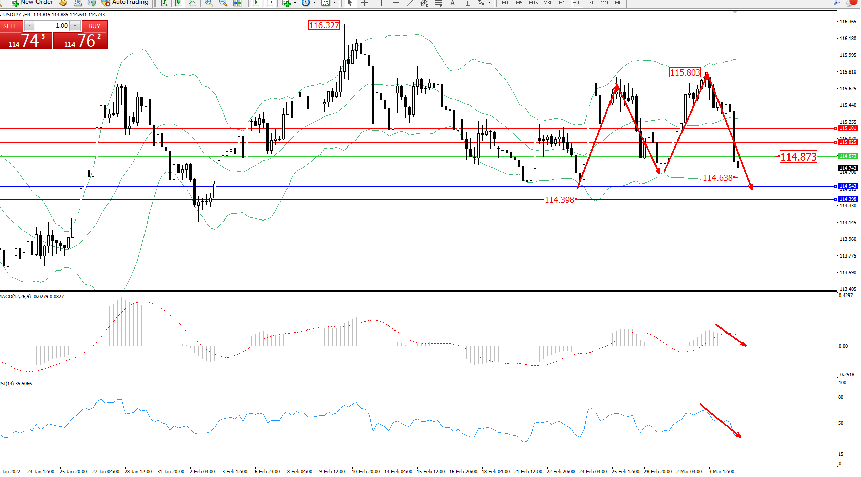 技术点评:长时间维持在布林带指标通道内宽幅震荡,期间多次来回刺探上下轨区间节点,短期触及下轨114.638附近整理,布林带指标呈张口走势持续平移中,MACD指标处于多头区域维持弱势整理回撤至0轴线附近徘徊,RSI指标空头动力维持震荡下行至50均衡线下侧不断向下移动;