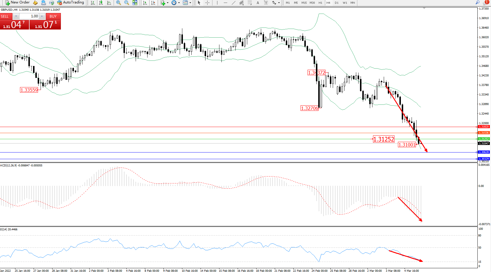 技术点评:空头动力延续布林带指标下轨附近不断震荡下行,低位抵达1.31001位置后短暂整理,空头下行趋势态势良好,短期未见有止步迹象,布林带指标呈张口走势良好,MACD指标处于空头区域维持震荡向下移动中,RSI指标处于空头区域维持弱势向下移动中;