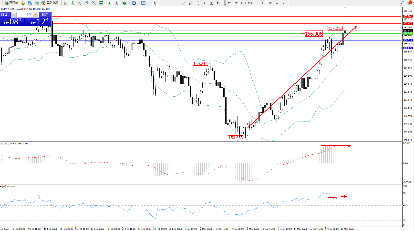交易策略:156.906上方看涨,目标157.477、157.881