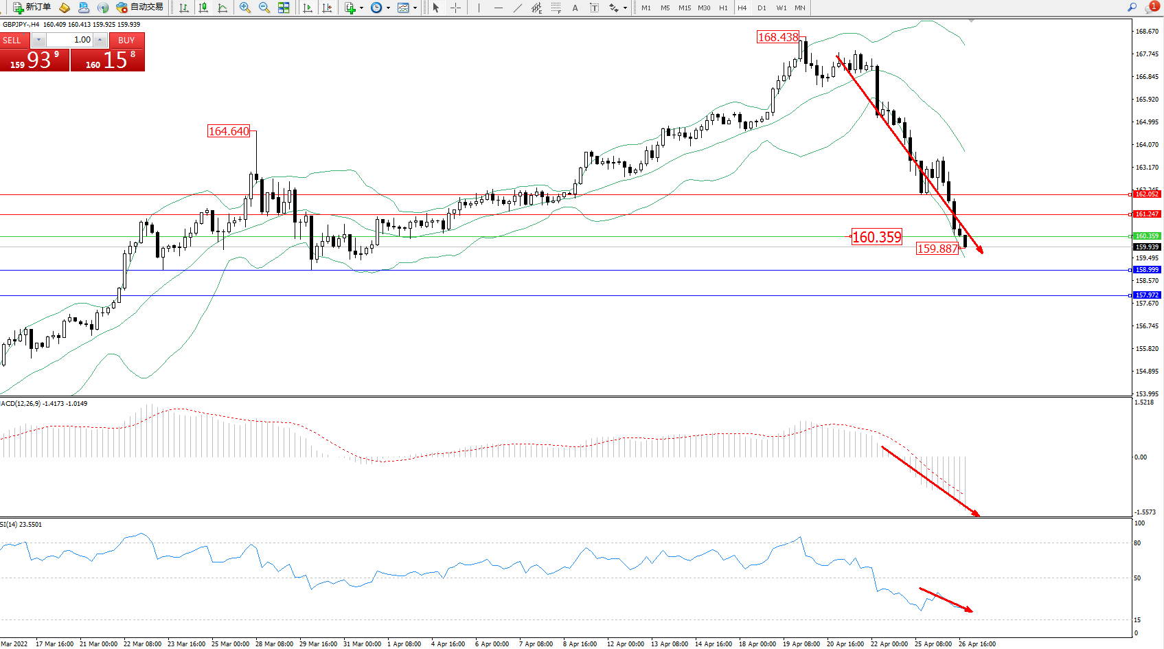 交易策略:160.359下方看跌,目标158.999、157.972