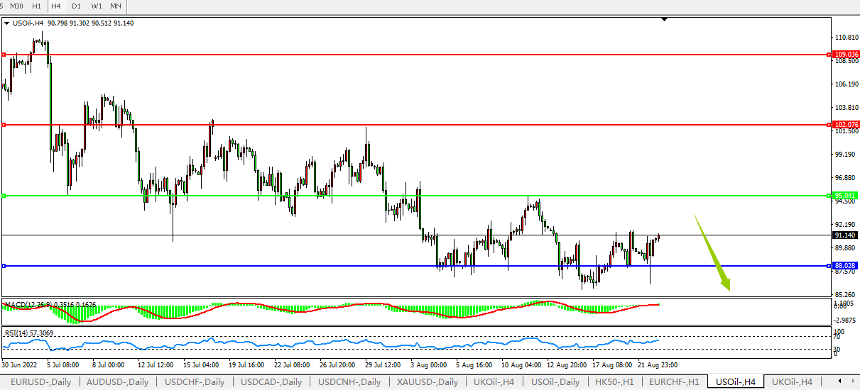 4小时图看:油价持续小幅反弹, MACD量能柱0轴下方持续缩量,RSI指标中性,短期价格延续反弹概率较大,中期依旧不容乐观。