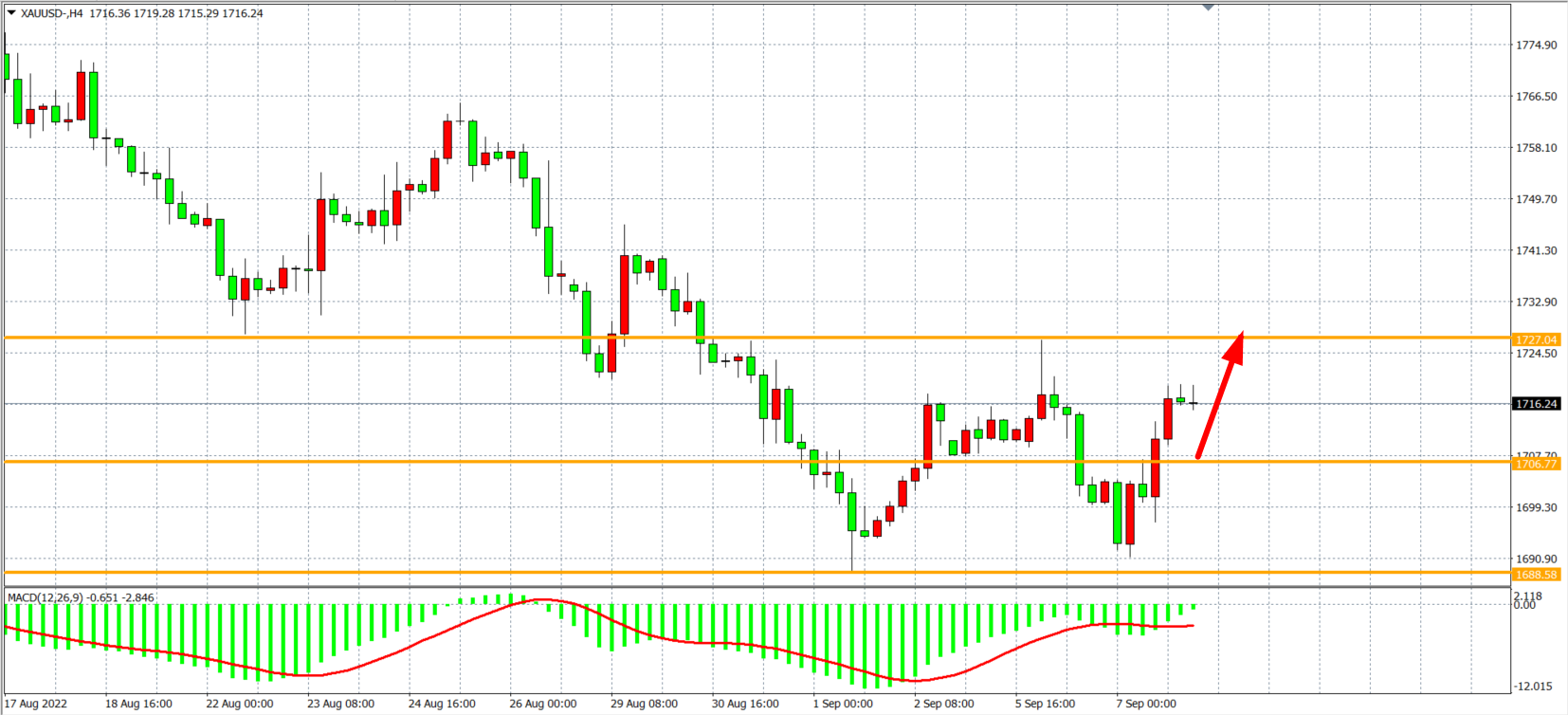 1小时图看,金价于1690附近获得支撑开启强劲反弹,MACD于零轴之上强势放量,显示趋势开始重新进入多头,连破关键阻力后目前支撑已上移至1706附近,同时上方1727为前高点阻力,日内在1706之上看反弹为主,上破1727有望打开上行空间看至1740之上
