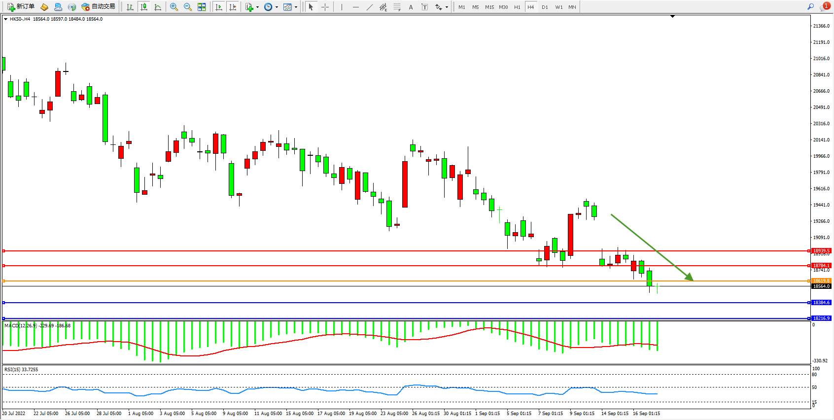 香港恒生指数9月19日(周一)收盘下跌195.72点,跌幅1.04%,报18565.97点;市场警惕美联储超预期加息100个基点,全球金融市场表现疲弱。港股再度下挫,恒指跌1.04%,创3月16日以来新低,恒生科技指数跌2.07%,三者齐刷近日低位。大型科技股继续下跌,香港本地股亦多数走强,燃气股、香港银行股部分上涨。香港贸发局表示,第三季香港出口指数环比升1.9点至32.8,反映港商对短期出口前景渐趋正面。然而,贸易价值指数急挫11.5点至40.2,显示他们仍要面对单价下调的压力。贸发局研究总监范婉儿指出,市场忧虑外部环境持续恶化,令复苏步伐较预期慢。