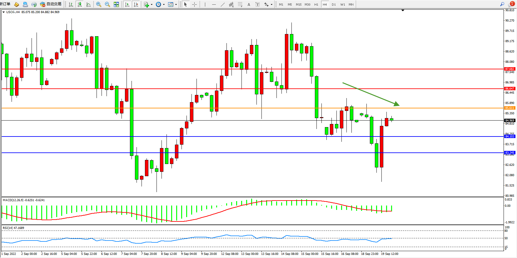 4小时图看:空头动力维持宽幅震荡下行,低位短期快速下行拉升后整理,市场空头情绪依旧,MACD指标处于0轴线下侧徘徊,RSI指标处于50均衡线附近弱势整理;