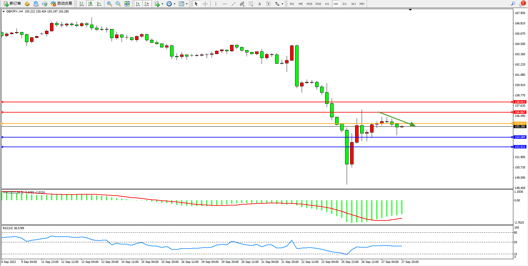 4小时图看:低位多头短期震荡上移后遇阻,空头再度伺机入场,缓慢整理后有再度下移迹象,MACD指标处于空头区域维持整理上行,RSI指标处于50均衡线下侧弱势徘徊;
