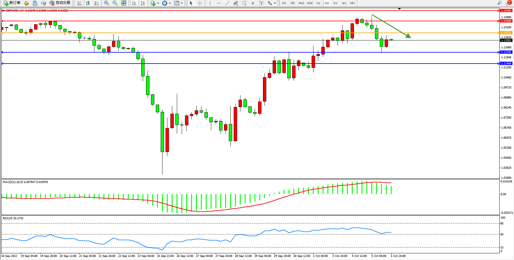 4小时图看:高位空头动力开始伺机入场,震荡下移,短期空头动力有继续回撤向下移动态势,MACD指标处于多头区域高位整理平缓下移,RSI指标处于50均衡线上側弱势徘徊;