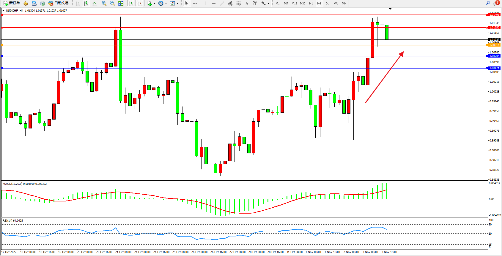 4小时图看:多头动力强势拉升上扬,抵达前期高位附近后遇阻回撤,但上行趋势态势良好,MACD指标处于多头区域高位整理,RSI指标处于多头区域维持徘徊;