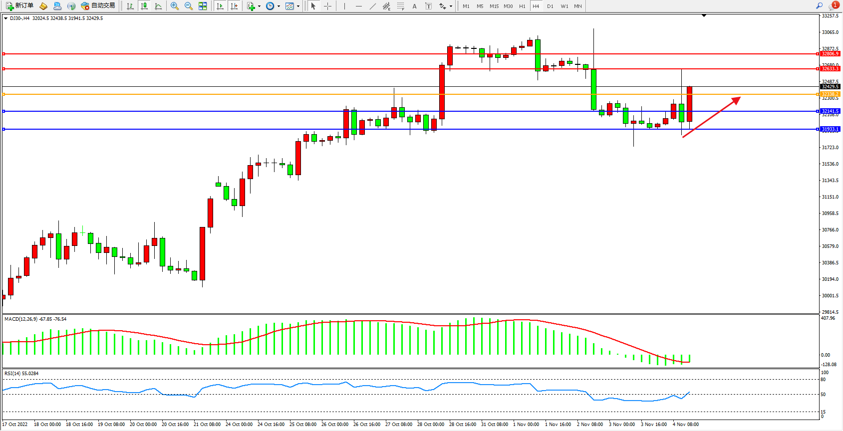 道琼斯指数11月4日(周五)收盘上涨401.97点,涨幅1.26%,报32403.22点;美国10月新增非农就业26.10万人,好于预期的20万,低于前值的26.3万,失业率3.7%,预期为3.6%,美国2个月就业人数被上修了,鉴于就业参与率下降的情况下,失业率上行第一眼看来是有点奇怪的