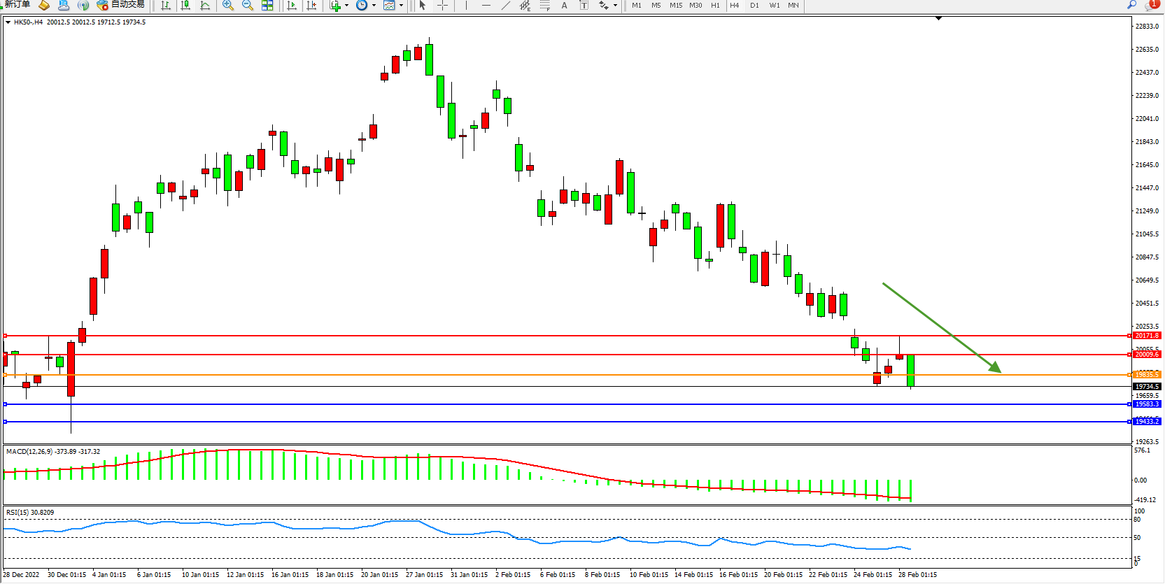 香港恒生指数2月28日(周二)收盘下跌157.57点,跌幅0.79%,报19785.94点;港股高开低走,三大指数午后跌幅进一步扩大,恒生科技指数跌至1.62%,恒指、国指分别跌0.79%和1.33%,恒指2万点得而复失,三者再度刷新回调低位。大型科技股午后全线下跌,港股短视频概念股逆势下跌,哔哩哔哩跌超3%,快手跌超1%。南下资金净流出9.65亿港元,大市成交额为1424亿港元。