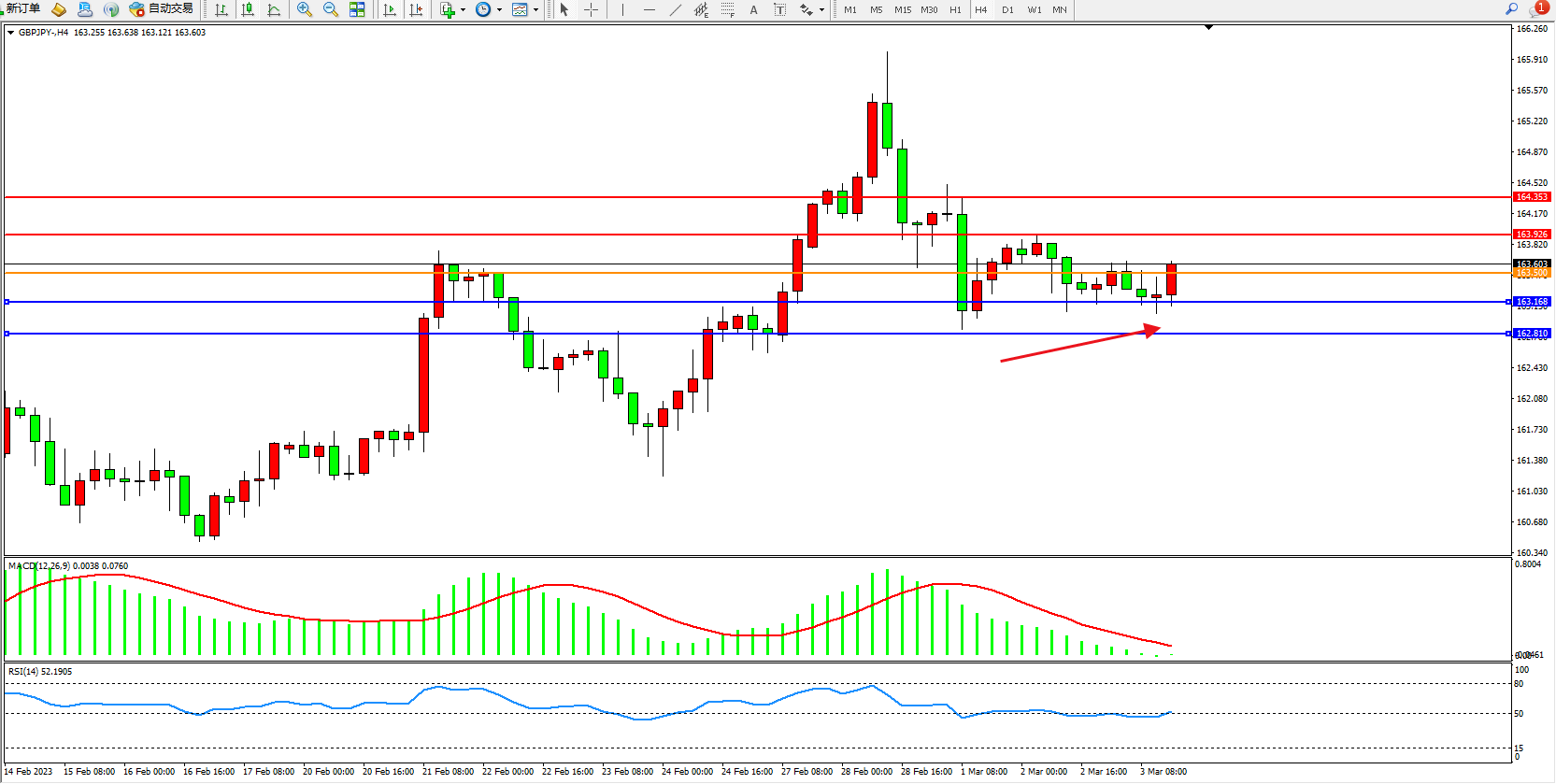 4小时图看:短期高位整理,市场整体处于弱势震荡,MACD指标处于0轴线附近弱势徘徊,RSI指标处于50均衡线附近弱势整理;