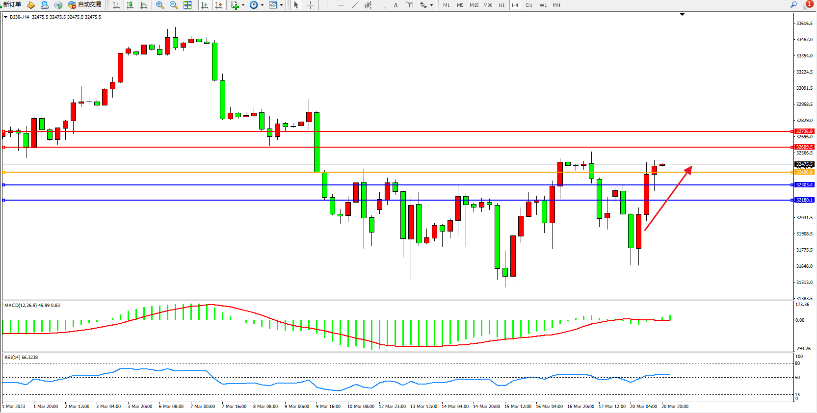 4小时图看:低位多头动力强势反转回升上移,短期看涨情绪开始涌现,多头动力不断向上移动中,MACD指标处于0轴线上側徘徊,RSI指标处于50均衡线上側弱势整理;