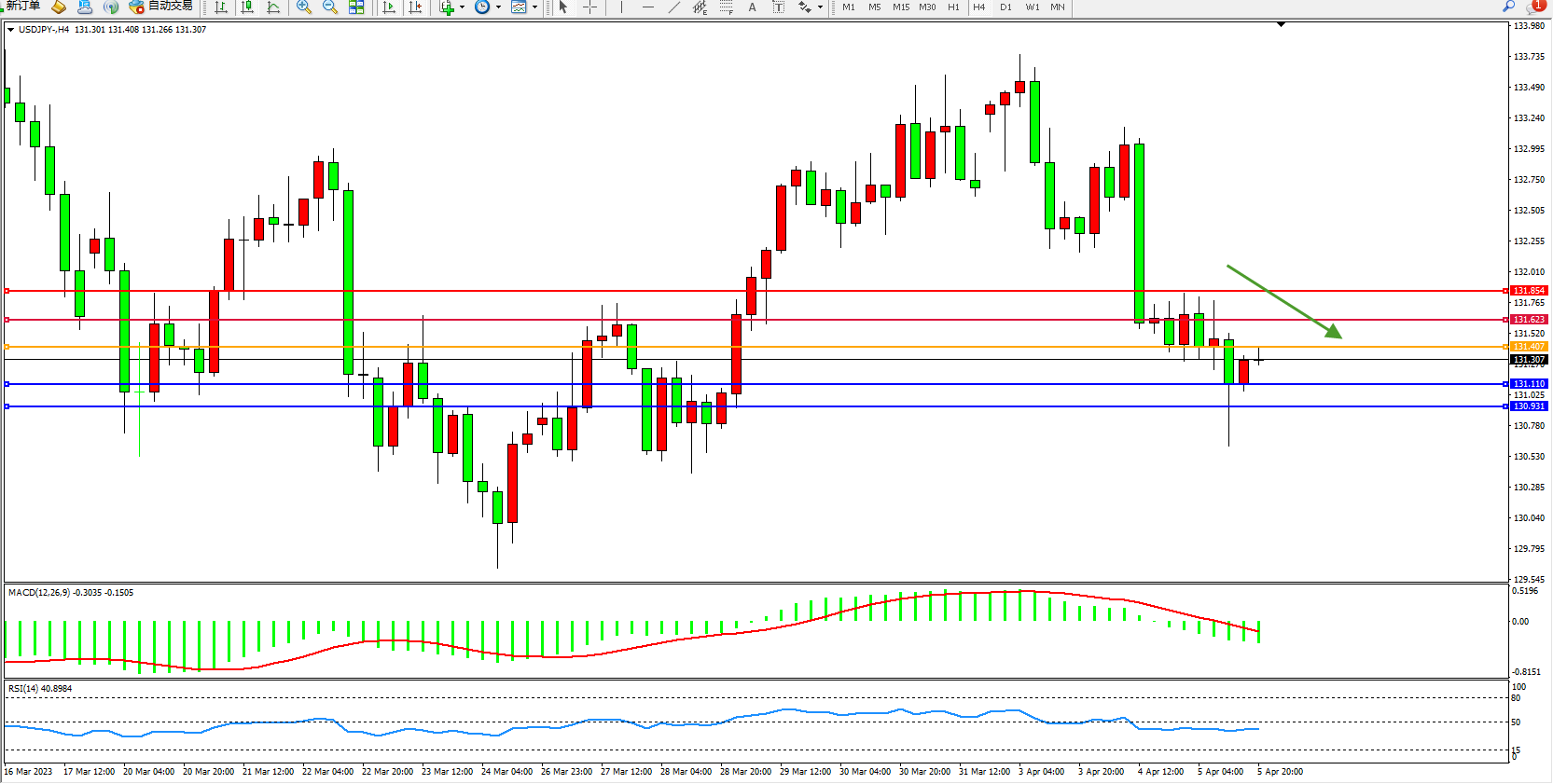 4小时图看:空头动力维持震荡下移,短期跌势或将持续,市场整体偏空头态势良好,MACD指标处于0轴线下侧持续下行,RSI指标处于50均衡线下侧弱势整理;