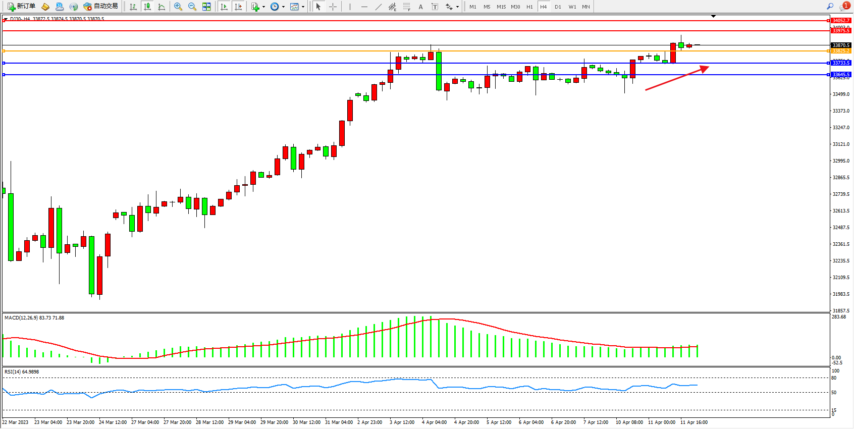 道琼斯指数4月11日(周二)收盘上涨98.60点,涨幅0.29%,报33685.12点;市场预计美国3月份通胀年率料将从2月份的6.0%降至5.2%。如果通胀的下降得到证实,甚至超过这一预期,那么美联储加息的预期将被坚定下调,导致美元进一步走低。