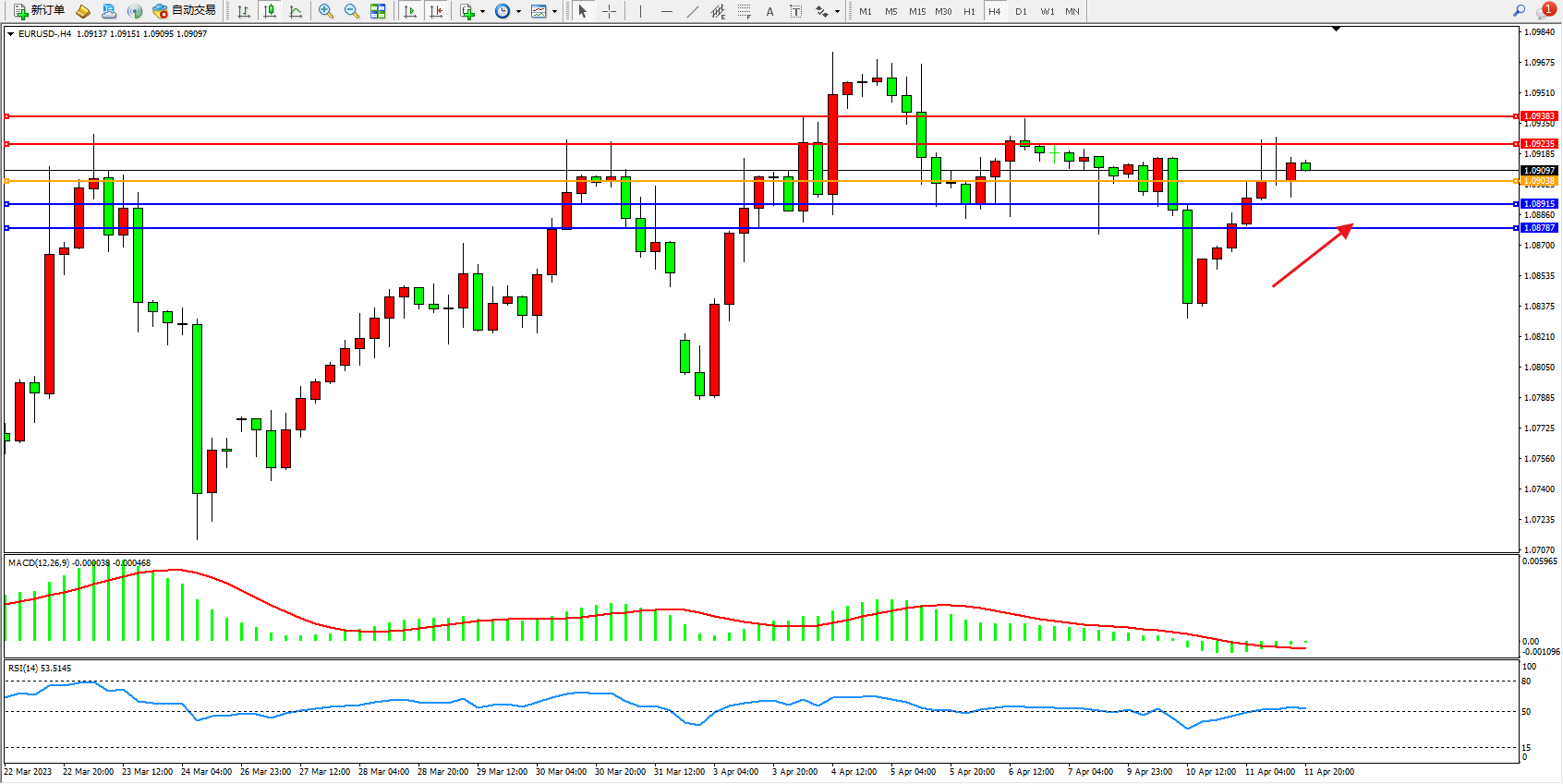 欧元兑美元维持1.09097附近震荡,欧元区4月Sentix投资者信心指数从3月的-11.1升至-8.7超出预期,欧元区投资者信心在3月意外下滑后,4月有所改善,因对现况的评估升至逾一年最高水平。