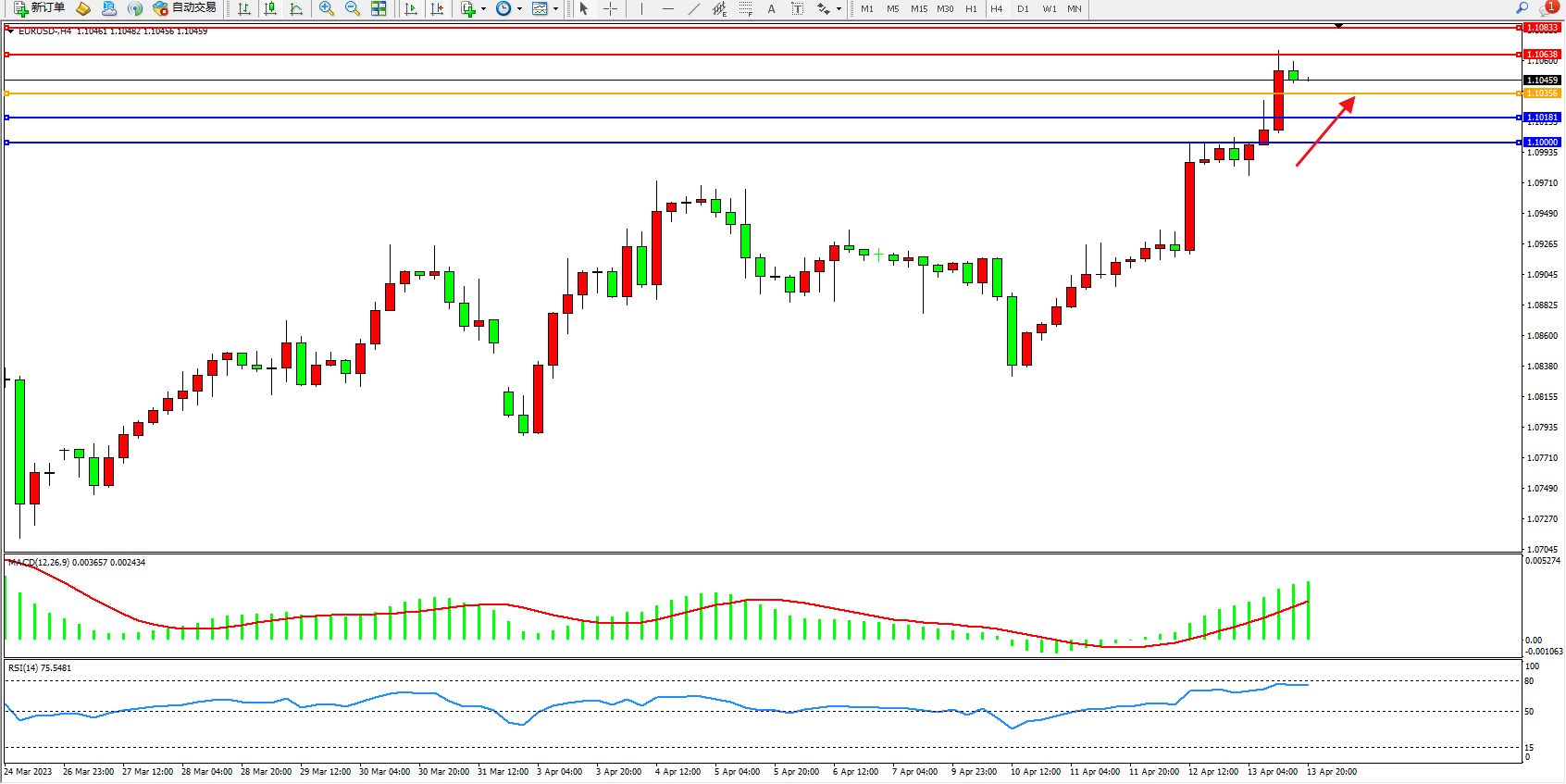 欧元美元EURUSD—4小时K线图显示: