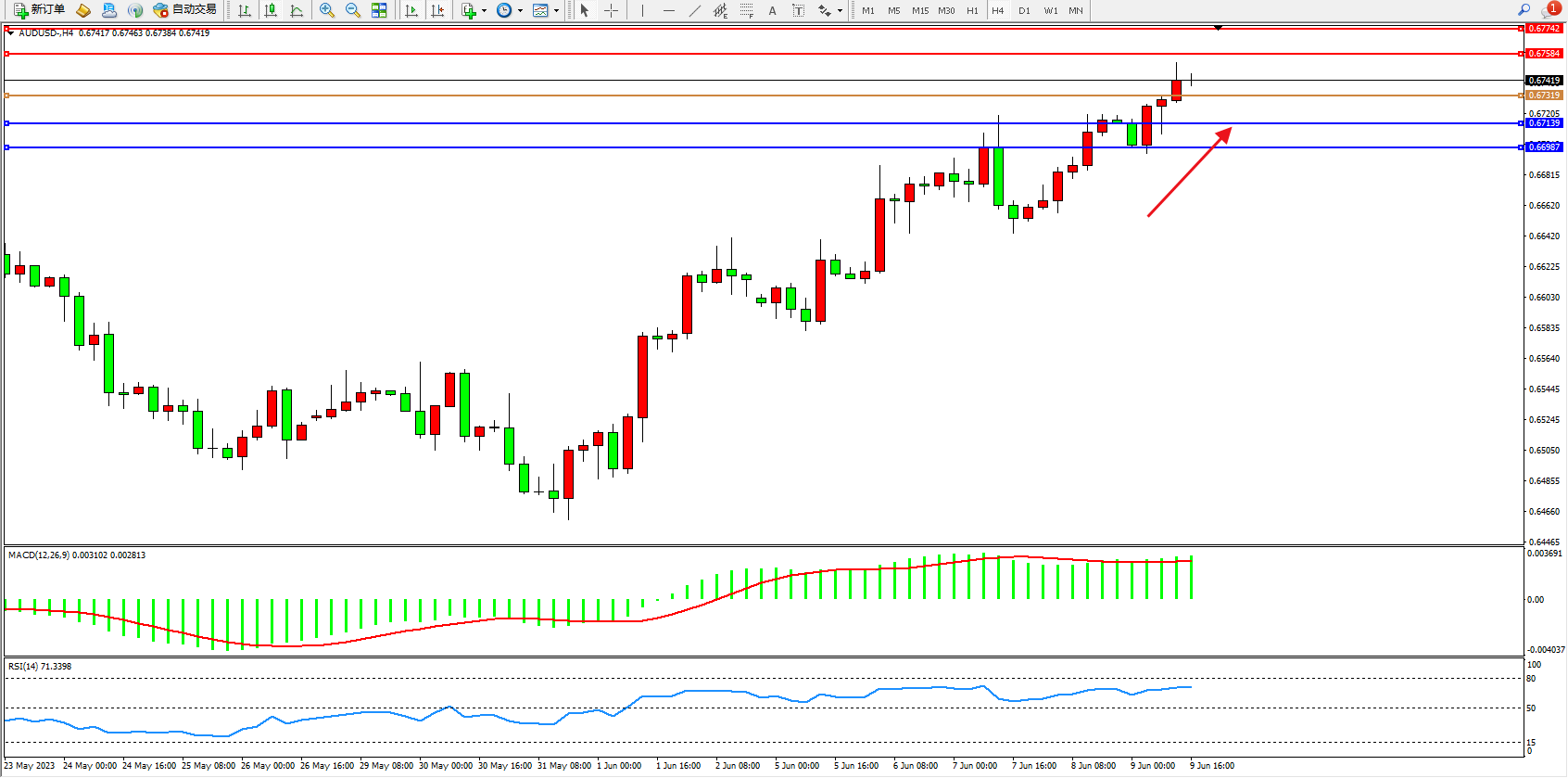 交易策略:0.67319上方看涨,目标0.67584 0.67742